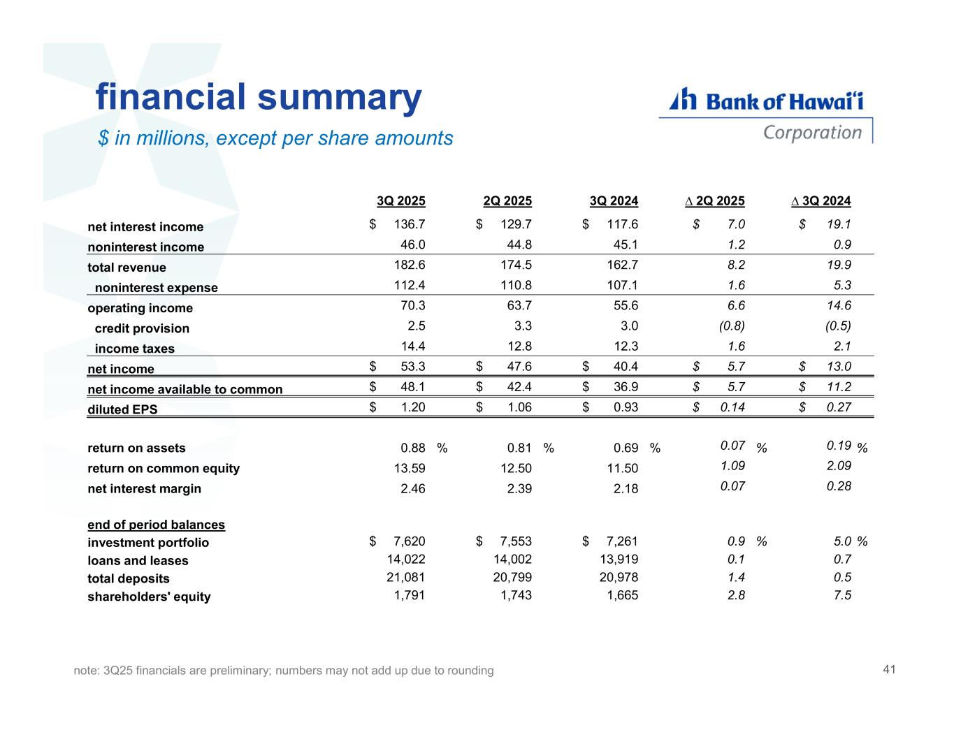 financial summary $ in millions, except per share amounts ∆ 3Q 2024∆ 2Q 20253Q 20242Q 20253Q 2025 $ 19.1 $ 7.0 $ 117.6 $ 129.7 $ 136.7 net interest income 0.9 1.2 45.1 44.8 46.0 noninterest income 19.9 8.2 162.7 174.5 182.6 total revenue 5.3 1.6 107.1 110.8 112.4 noninterest expense 14.6 6.6 55.6 63.7 70.3 operating income (0.5)(0.8)3.0 3.3 2.5 credit provision 2.1 1.6 12.3 12.8 14.4 income taxes $ 13.0 $ 5.7 $ 40.4 $ 47.6 $ 53.3 net income $ 11.2 $ 5.7 $ 36.9 $ 42.4 $ 48.1 net income available to common $ 0.27 $ 0.14 $ 0.93 $ 1.06 $ 1.20 diluted EPS % 0.19 % 0.07 % 0.69 % 0.81 % 0.88 return on assets 2.09 1.09 11.50 12.50 13.59 return on common equity 0.28 0.07 2.18 2.39 2.46 net interest margin end of period balances % 5.0% 0.9$ 7,261 $ 7,553 $ 7,620 investment portfolio 0.70.113,919 14,002 14,022 loans and leases 0.51.420,978 20,799 21,081 total deposits 7.52.81,665 1,743 1,791 shareholders' equity note: 3Q25 financials are preliminary; numbers may not add up due to rounding 41