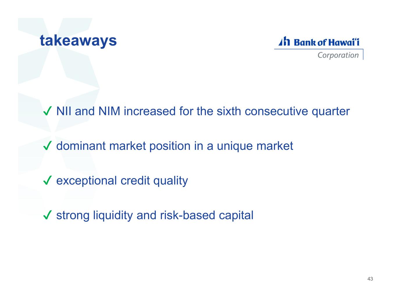 ✔ NII and NIM increased for the sixth consecutive quarter ✔ dominant market position in a unique market ✔ exceptional credit quality ✔ strong liquidity and risk-based capital takeaways 43