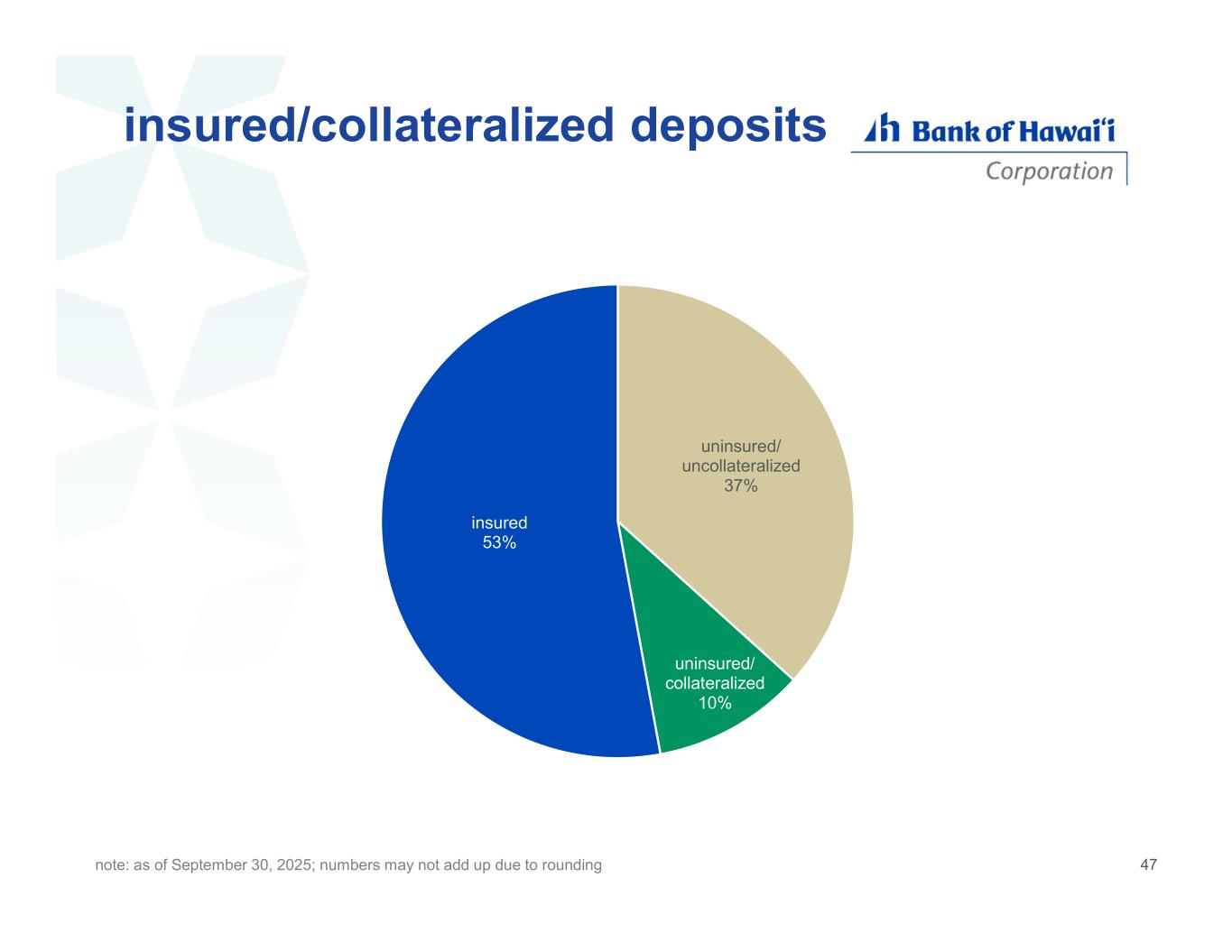 insured/collateralized deposits uninsured/ uncollateralized 37% uninsured/ collateralized 10% insured 53% note: as of September 30, 2025; numbers may not add up due to rounding 47