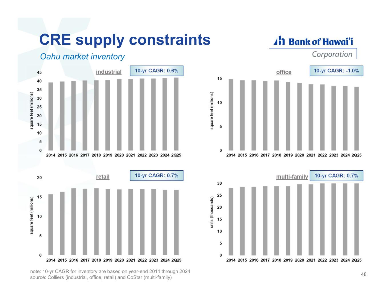inventory (sq ft)vacancy 10 yr CAGR10 yr avg2Q242Q25 0.63%1.63%1.05%1.47%industrial -1.01%12.42%13.57%13.20%office 0.72%6.08%6.09%5.33%retail 0.68%4.73%3.98%3.48%multi-family Oahu market vacancies and inventory stable real estate market note: 10-year average vacancy and 10-yr CAGR for inventory are based on year-end 2014 through 2024 source: Colliers (industrial, office, retail) and CoStar (multi-family) 24