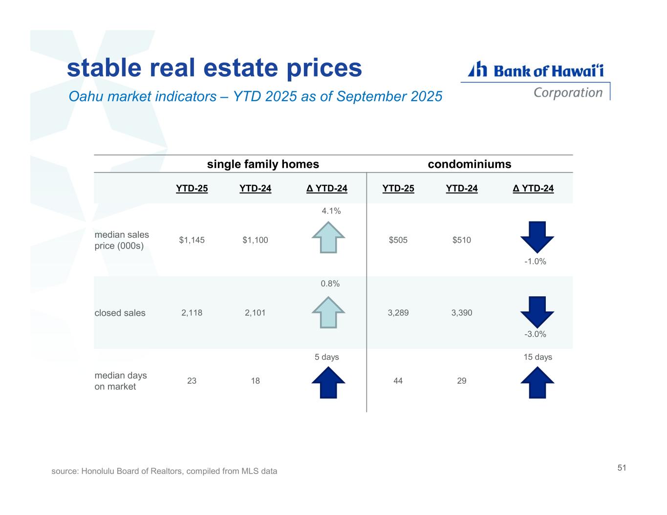 condominiumssingle family homes Δ YTD-24YTD-24YTD-25Δ YTD-24YTD-24YTD-25 -1.0% $510$505 4.1% $1,100$1,145 median sales price (000s) -3.0% 3,3903,289 0.8% 2,1012,118closed sales 15 days 2944 5 days 1823 median days on market stable real estate prices Oahu market indicators – YTD 2025 as of September 2025 source: Honolulu Board of Realtors, compiled from MLS data 51