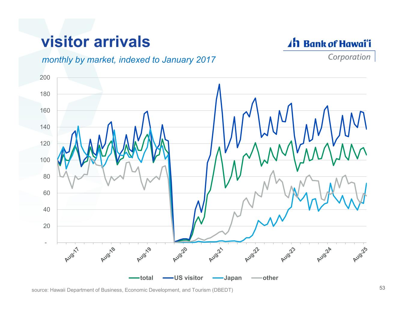 53 visitor arrivals monthly by market, indexed to January 2017 source: Hawaii Department of Business, Economic Development, and Tourism (DBEDT) - 20 40 60 80 100 120 140 160 180 200 total US visitor Japan other