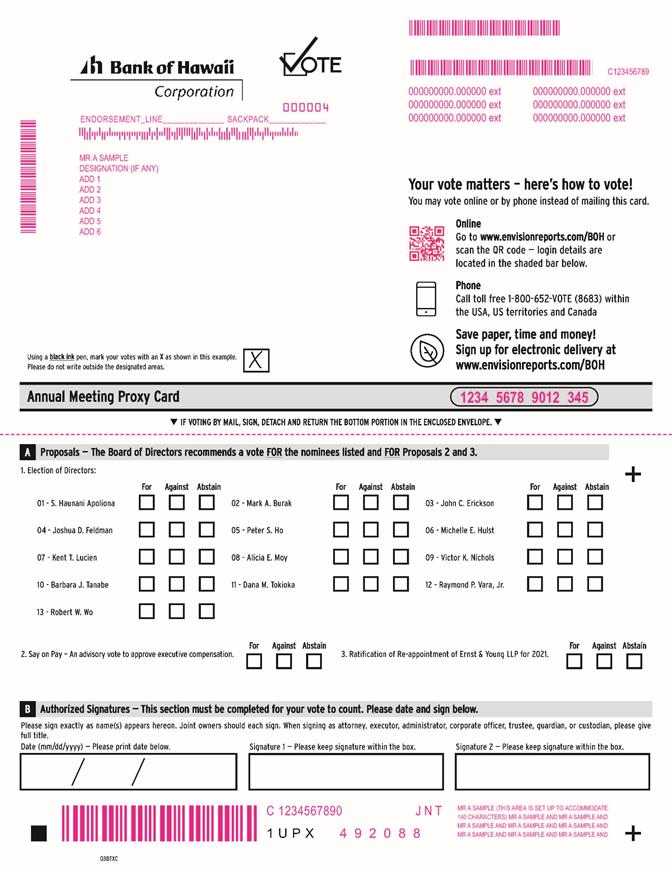 MMMMMMMMMMMM MMMMMMMMMMMMMMM C123456789 000000000.000000 ext 000000000.000000 ext 000000000.000000 ext 000000000.000000 ext 000004 ENDORSEMENT_LINE______________ SACKPACK_____________ 000000000.000000 ext 000000000.000000 ext MMMMMMMMM MR A SAMPLE DESIGNATION (IF ANY) ADD 1 ADD 2 ADD 3 ADD 4 ADD 5 ADD 6 Using a black ink pen, mark your votes with an X as shown in this example. Please do not write outside the designated areas. Your vote matters – here’s how to vote! You may vote online or by phone instead of mailing this card. Online Go to www.envisionreports.com/BOH or scan the QR code — login details are located in the shaded bar below. Phone Call toll free 1-800-652-VOTE (8683) within the USA, US territories and Canada Save paper, time and money! Sign up for electronic delivery at www.envisionreports.com/BOH Annual Meeting Proxy Card 123456789012345 • IF VOTING BY MAIL, SIGN, DETACH AND RETURN THE BOTTOM PORTION IN THE ENCLOSED ENVELOPE. • Proposals — The Board of Directors recommends a vote FOR the nominees listed and FOR Proposals 2 and 3. A 1. Election of Directors: + For Against Abstain For Against Abstain For Against Abstain 01 -S. Haunani Apoliona 02 -Mark A. Burak 03 -John C. Erickson 04 -Joshua D. Feldman 05 -Peter S. Ho 06 -Michelle E. Hulst 07 -Kent T. Lucien 08 -Alicia E. Moy 09 -Victor K. Nichols 10 -Barbara J. Tanabe 11 -Dana M. Tokioka 12 -Raymond P. Vara, Jr. 13 -Robert W. Wo For Against Abstain For Against Abstain 2. Say on Pay – An advisory vote to approve executive compensation. 3. Ratification of Re-appointment of Ernst & Young LLP for 2021. Authorized Signatures — This section must be completed for your vote to count. Please date and sign below. B Please sign exactly as name(s) appears hereon. Joint owners should each sign. When signing as attorney, executor, administrator, corporate officer, trustee, guardian, or custodian, please give full title. Date (mm/dd/yyyy) — Please print date below. Signature 1 — Please keep signature within the box. Signature 2 — Please keep signature within the box. MR A SAMPLE (THIS AREA IS SET UP TO ACCOMMODATE C 1234567890 J N T 140 CHARACTERS) MR A SAMPLE AND MR A SAMPLE AND MR A SAMPLE AND MR A SAMPLE AND MR A SAMPLE AND 1UPX 492088 MR A SAMPLE AND MR A SAMPLE AND MR A SAMPLE AND MMMMMMM +