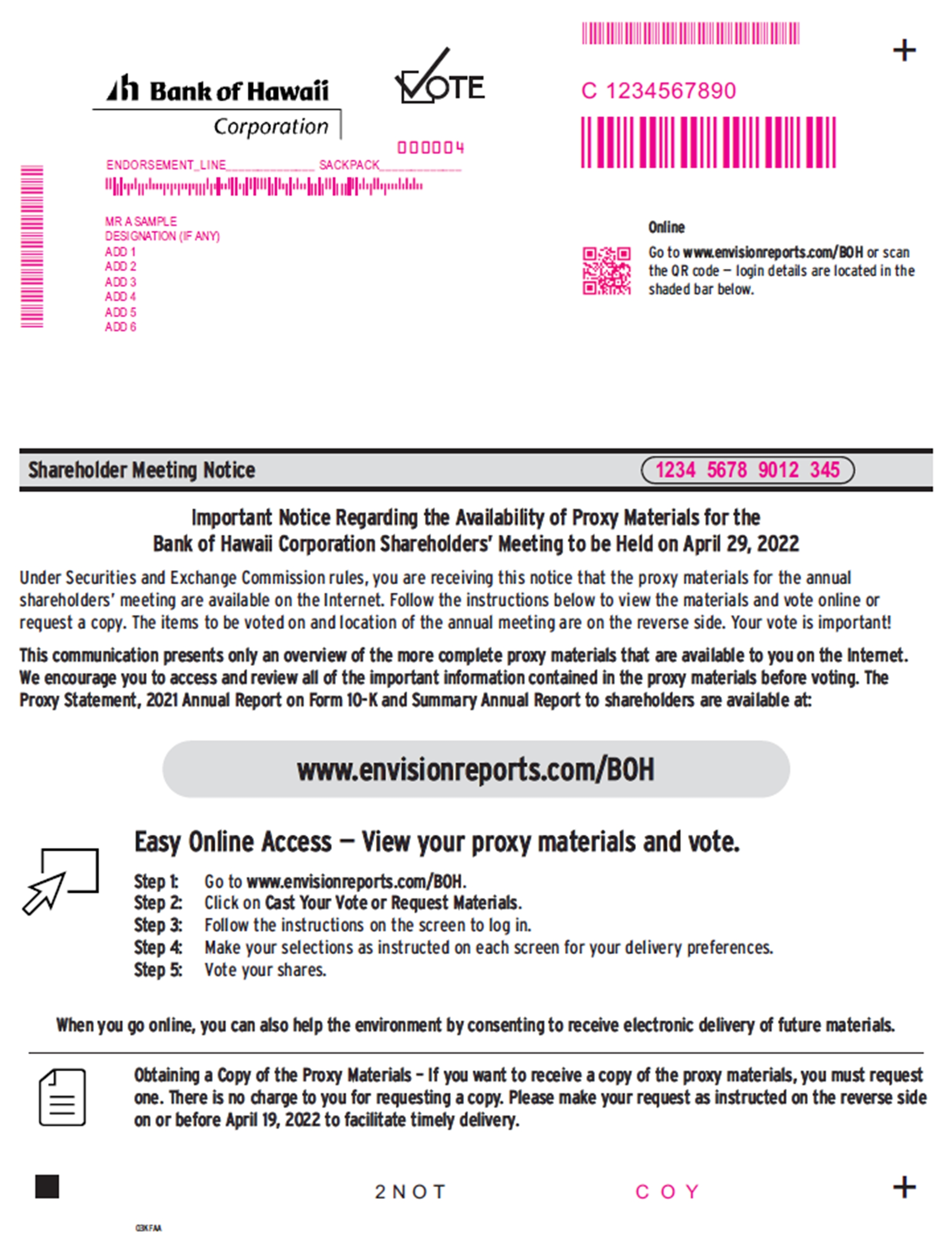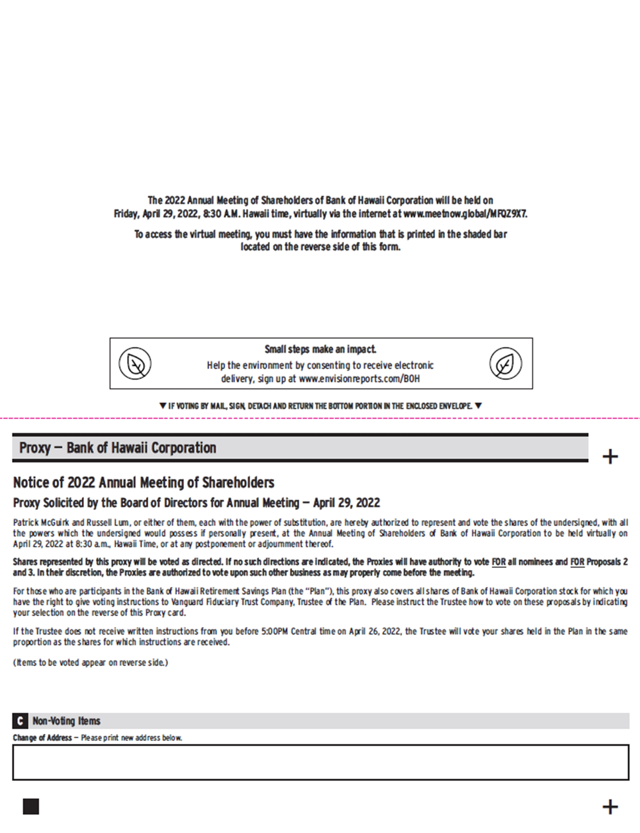 The 2022 Annual Meeting of Shareholders of Bank of Hawaii Corporation will be held via live webcast on Friday, April 29, 2022, at 8:30 a.m. Hawaii Standard Time. Each shareholder will be asked to provide their control number when logging in to attend the virtual Annual Meeting. Shareholders who hold shares through an intermediary, such as a bank or broker, will also be able to use the control number provided by their bank or broker to attend and participate at the virtual Annual Meeting. More detailed instructions on how to attend and vote at the virtual Annual Meeting are found on pages 3 and 4.