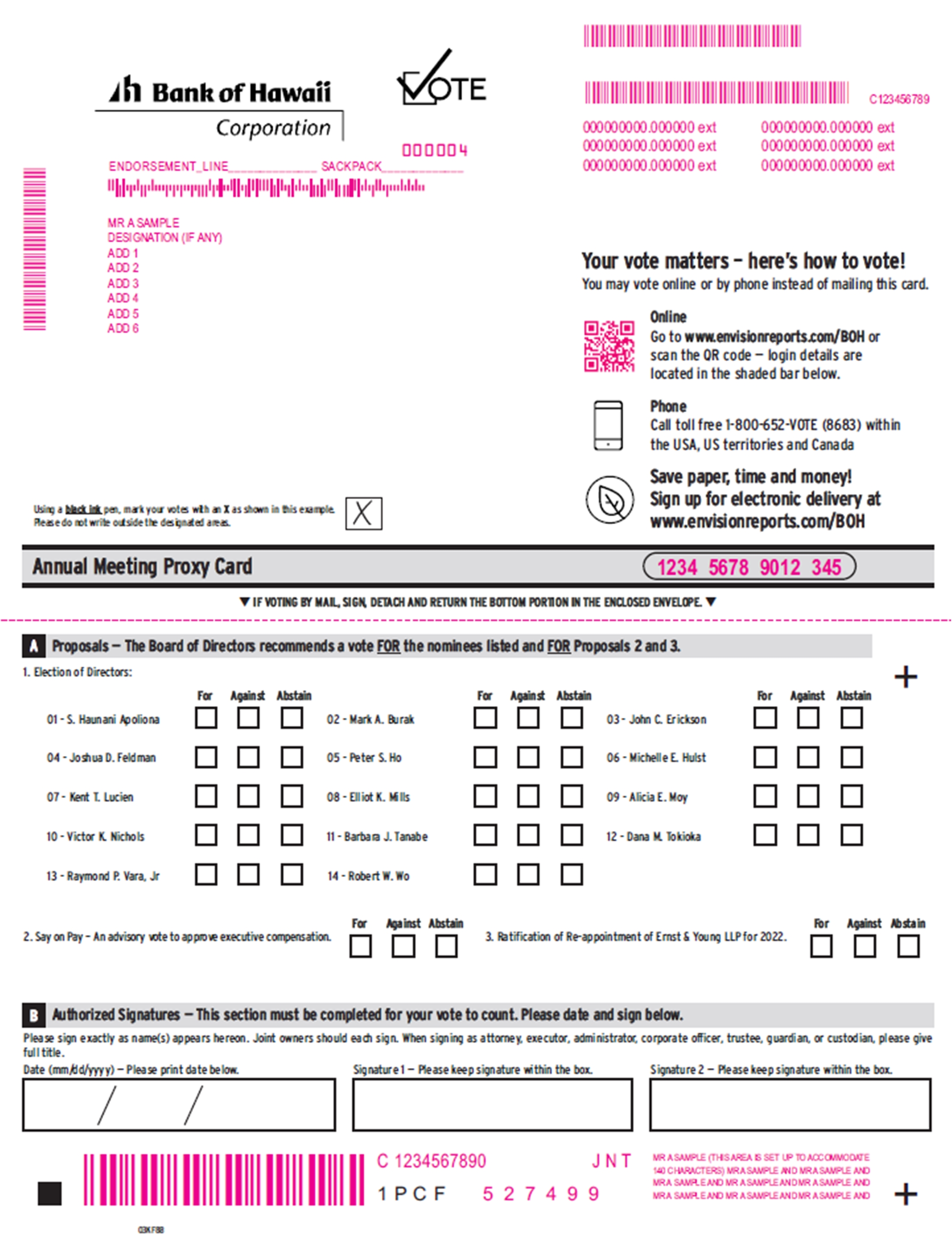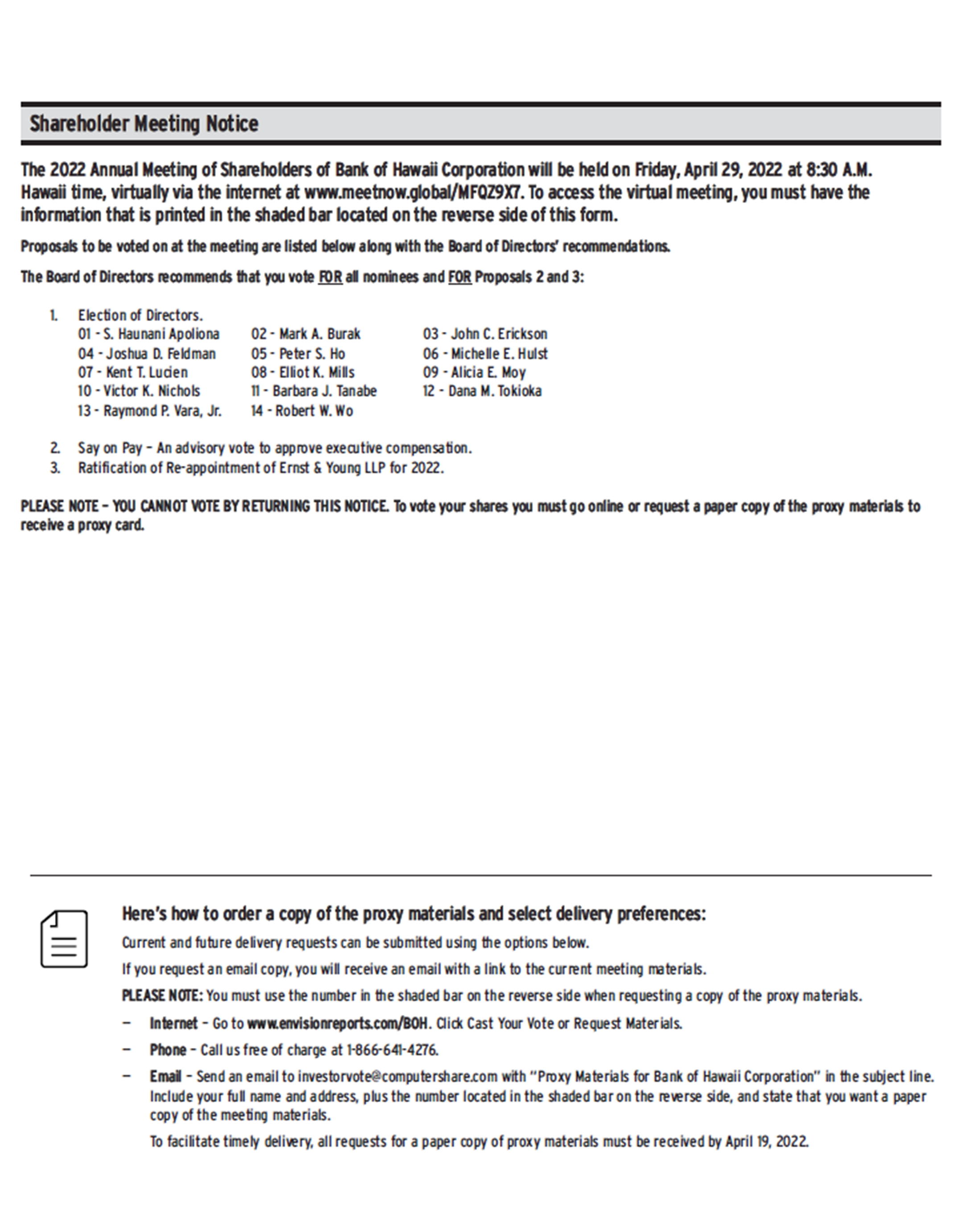The Notice of Meeting and Proxy Statement accompanying this letter describe the business we will consider and vote upon at the meeting. A report to shareholders on the affairs of Bank of Hawaii Corporation also will be given and shareholders will have the opportunity to ask about matters of interest concerning the Company through the virtual meeting platform during the virtual Annual Meeting.