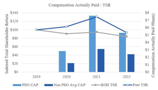 The graphs below reflect the relationship between the PEO and Average Non-PEO NEO CAP with 1) the Bank’s and the peer group’s total shareholder return (assuming an initial fixed investment of $100), 2) the Bank’s Net Income, and 3) the Bank’s return on common equity for the fiscal years 2020, 2021, and 2022: