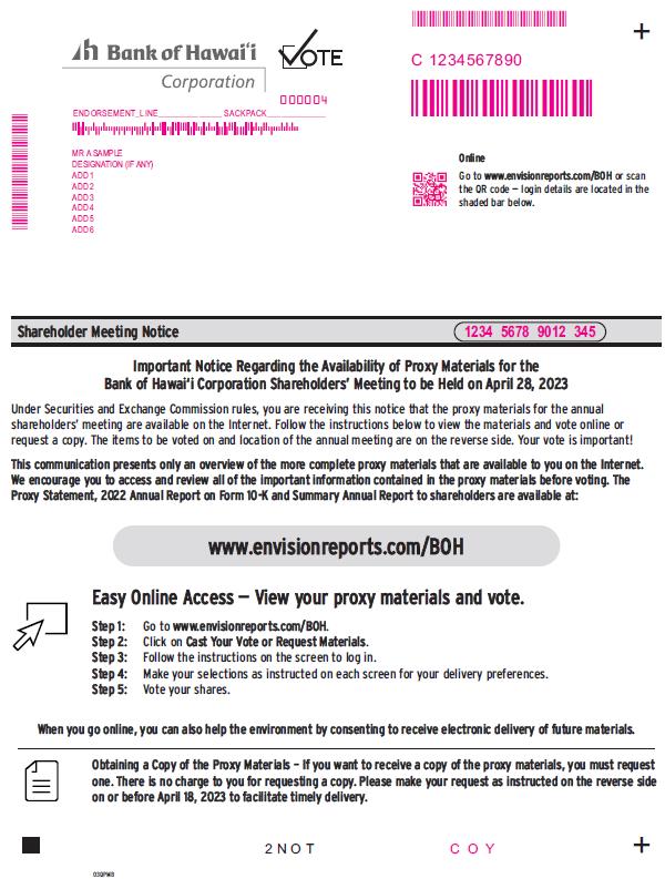 Bank of Hawai’i Vote Corporation 000004 ENDORSEMENT LINE SACKPACK C1234567890 MR A SAMPLE DESIGNATION (IF ANY) ADD1 ADD2 ADD3 ADD4 ADD5 ADD6 online Go to www.envisinreports.com/BOH or scan the QR code – login details are located in the shaded bar below Shareholders Meeting Notice 123456789012345 Important Notice Regarding the Availability of Proxy Materials for the Bank of Hawai’i Corporation Shareholders’ Meeting to be Held on April 28, 2023 Under Securities and Exchange Commission rules, you are receiving this notice that the proxy materials for the annual shareholders’ meeting are available on the Internet. Follow the instructions below to view the materials and vote online or request a copy. The items to be voted on and location of the annual meeting are on the reverse side. Your vote is important! This communication presents only an overview of the more complete proxy materials that are available to you on the Internet. We encourage you to access and review all of the important information contained in the proxy materials before voting. The Proxy Statement, 2022 Annual Report on form 10-K and Summary Annual Report to shareholders are available at: www.envisionreports.com/BOH Easy Online Access – View your proxy materials and vote. Step 1: Go to www.envisionreports.com/BOH. Step 2: Click on Cast Your Vote or Request Materials. Step 3: Follow the instructions on the screen to log in. Step 4: Make your selections as instructed on each screen for your delivery preferences. Step 5: Vote your shares. When you go online, you can also help environment by consenting to receive electronic delivery of future materials. Obtaining a copy of the Proxy Materials – If you want to receive a copy of the proxy materials, you must request one. There is no charge to you for requesting a copy. Please make your request as instructed on the reverse side on or before April 18, 2023 to facilitate timely delivery. 2 NOT COY Q30PJC