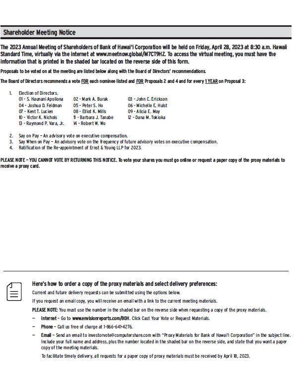 Shareholder Meeting Notice The 2023 Annual Meeting of Shareholders of Bank of Hawai’i Corporation will be held on Friday, April 28, 2023 at 8:30 a.m. Hawaii Standard time, virtually via the internet at www.meetnow.global/M7ct9hz. To access the virtual meeting, you must have the information that is printed in the shaded bar located on the reverse side of this form. Proposals to be voted on at the meeting are listed below along with the board of directors’ recommendations. The board of directors recommends a vote for each nominee listed and for proposals 2 and 4 and for every 1 year on proposal 3: 1 election of directors. 01 s. haunani apoliona 02 – mark A. burak 03 – john c. Erickson 04 - Joshua d. feldman 05 - peter s. ho 06 - michelle e. hulst 07 – kent t. Lucien 08 – Elliot k. mills 09 – Alicia e. Moy 10 – victor k. Nichols 11 – Barbara j. Tanabe 12 – dana m.tokioka 13 – roymond p.vara, jr. 14 – Robert w. wo 2 say on pay - an advisory vote an executive compensation. 3. say when on pay – an advisory vote on the frequency of future advisory votes on executive compensation. 4. ratification of the re-appointment of erist & Young LLP for 2023. Please note – you cannot vote by returning this notice. To vote your shares you must go online or request a paper copy of the proxy materials to receive a proxy card. Here’s How To Order A Copy Of The Proxy Materials And Select Delivery Preferences: Current And Future Delivery Requests Can Be Submitted Using The Options Below If You Requests An Email Copy, You Will Receive An Email With A Link To The Current Meeting Materials Please Note: You Must Use The Number In The Shaded Bar On The Rverse Side When Requesting A Copy Of the proxy Materials. Internet - Go To Www.Envisionrreports.Com/Boh. Click Cast Your Vote Or Requests Materials. Phone - Call Us Free Of Charge At 1-866-641-4276. Email Send Email To Investorvote@ComputerShare.Com With “Proxy Materials For Bank Of Hawai’i Corporation” In The Subject Line. Include Your Full Name And Address, Plus The Number Located In The Shaded Bar On The Reverse Side, And State That You Want A Paper Copy Of The Meeting Materials. To Facilitate Timely Delivery, All Requests For A Paper Copy Of Proxy Materials Must Be Received By April 18 2023.