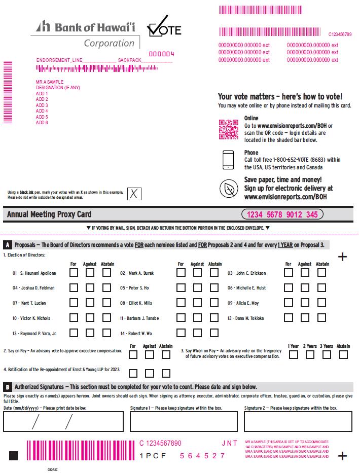 Bank of Hawai’i Vote Corporation 000004 Endorsement Line SackPack Mr A Sample designation (if any) Add 1 Add 2 Add 3 Add 4 Add 5 Add 6 000000000000000 Ext 000000000000000 Ext 000000000000000 Ext 000000000000000 Ext 000000000000000 Ext 000000000000000 Ext C123456789 Your Vote Matters - Here’s How To Vote! You May Vote Online Or By Phone Instead Of Mailing This Card. Online Go To www.envisionreports.com/BOH Or Scan The QR Code - Login Details Are Located In The Shaded Bar Below. Phone Call Toll Free 1-800-652 Vote (8683) Within The USA, Us Territories And Canada Save Paper, Time and Money! Sign Up For Electronic Delivery At www.envisionreports.com/BOH 123456789012345 Using A Black Ink Pen Mark Your Votes with an X as Shown In This Example Please Do Not Write Outside The Designated Areas X If Voting by Mail, Sign, Detach And Return The Bottom Portion In The Enclosed Envelope. Annual Meeting Proxy Card A proposals - The Board Of Directors Recommends a vote For Each Nominee Listed And For Proposals 2 And 4 And Every 1 Year On Proposal 3 1 Election of Directors: For Against Abstain For Against Abstain For Against Abstain 01 - S. Haunani Apoliona 02 - Mark A. Burak 03 - John C. Erickson 04 - Joshua D. Feldman 05 - Peter S. Ho 06 - S Ho 06 - Michelle E. Hulst 07 - Kent T. Lucien 08 - Elliot K. Mills 09 - Alicia E. Moy 10 - Victor K. Nicholis 11 - Barbara J. Tanabe 12 - Dana M. Tokioka 13 - Raymond P. Vara Jr. 14 - Robert W. Wo 2. Say On Pay - An Advisory Vote To Approve Executive Compensation For Against Abstain 3. Say When On Pay - An Advisory Vote On The Frequency Of Future Advisory Votes On Executive Compensation. 1 Year2 Year 3 Year Abstain 4. RATIFICATION Of The Re Appointment Of Emst & Young LLP For 2023. B Authorized Signature - This Section Must Be Completed For Your Vote To Count. Please Date and Sign Below. Please Sign Exactly As Name(S) Appears Hereon. Joint Owner Should Each Sign. When Signing As Attorney, Executor, Administrator, Corporate Officer, Trustee, Guardian, Or Custodian Please Give Full Title. Date (mm/dd/yyyy) Please Print Date Below. Signature 1 - Please Keep Signature Within The Box. Signature 2 - Please Keep Signature Within The Box. C1234567890 JNT 1 pcf 564527 Mr A Sample (This Area Is Set Up To Accommodate 140 Characters) MRA Sample And MRA Sample MRA Sample And Mr A Sample And MRA Sample And Sample And Mr A Sample And + Q30PJC