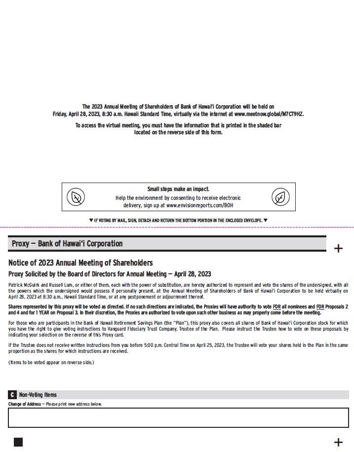 The 2023 Annual Meeting of Shareholders of Bank of Hawai’i Corporation will be held on Friday, April 28, 2023, 8:00 a.m. Hawaii Standard Time, virtually via the internet at www.meetnow.global/M7CT9HZ. To access the virtual meeting, you must have the information that is printed in the shaded bar located on the reverse side of this form. Small steps make an impact. Help the environment by consenting to receive electronic delivery, sign up at www.envisionreports.com/BOH IF VOTING BY MAIL, SIGN, DETACH AND RETURN THE BOTTOM PORTION IN THE ENCLOSED ENVELOPE Proxy - Bank of Hawai’I Corporation Notice of 2023 Annual Meeting of Shareholders Proxy Solicited by the Board of Directors for Annual Meeting – April 28, 2023 Patrick McGuirk and Russell Lum, or either of them each with the power of substitution, are hereby authorized to represent and vote the shares of the undersigned, with all the powers which the undersigned would possess if personally present, at the Annual Meeting of Shareholders of Bank of Hawai’i Corporation to be held virtually on April 28, 2023 at 8:30 a.m., Hawaii Standard Time, or at any postponement or adjournment thereof. Shares represented by this proxy will be voted as directed. If no such directions are indicated, the Proxies will have authority to vote FOR all nominees and FOR Proposals 2 and 4 and for 1 YEAR on Proposal 3. In their discretion, the Proxies are authorized to vote upon such other business as may properly come before the meeting. For those who are participants in the Bank of Hawaii Retirement Savings Plan (the “Plan”), this proxy also covers all shares of Bank of Hawi’i Corporation stock for which you have the right to give voting instructions to Vanguard Fiduciary Trust Company, Trustee of the Plan. Please instruct the Trustee how to vote on these proposals by indicating your selection on the reverse of this Proxy card. If the Trustee does not receive written instructions from you before 5:00 p.m. Central Time on April 25, 2023, the Trustee will vote your shares held in the Plan in the same proportions as the shares for which instructions are received. (Items to be voted appear on reverse side.) C Non-Voting Items Change of Address – Please print new address below.