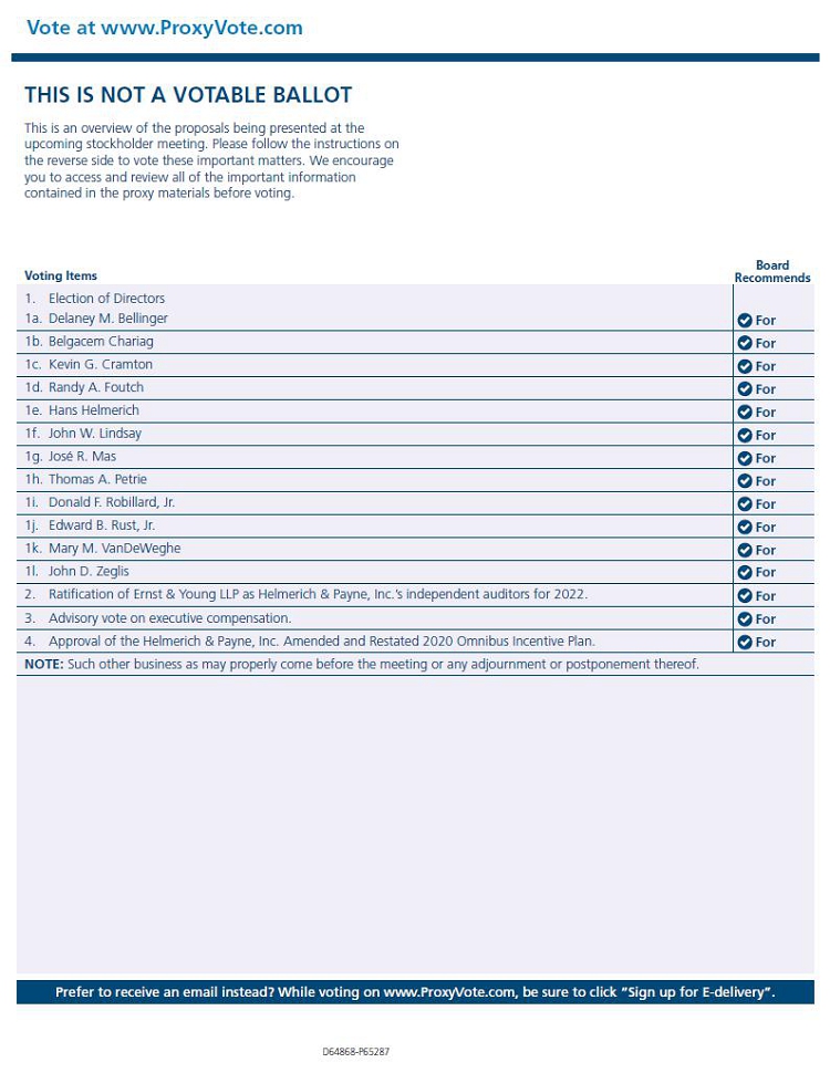 Vote at www.ProxyVote.com THIS IS NOT A VOTABLE BALLOT This is an overview of the proposals being presented at the upcoming stockholder meeting. Please follow the instructions on the reverse side to vote these important matters. We encourage you to access and review all of the important information contained in the proxy materials before voting. Voting Items Board Recommends D64868-P65287 1. Election of Directors 1c. Kevin G. Cramton 1a. Delaney M. Bellinger 1d. Randy A. Foutch 1b. Belgacem Chariag 1e. Hans Helmerich 1f. John W. Lindsay 1g. José R. Mas 1h. Thomas A. Petrie 1i. Donald F. Robillard, Jr. 1j. Edward B. Rust, Jr. 1k. Mary M. VanDeWeghe 1l. John D. Zeglis 2. Ratification of Ernst & Young LLP as Helmerich & Payne, Inc.’s independent auditors for 2022. 4. Approval of the Helmerich & Payne, Inc. Amended and Restated 2020 Omnibus Incentive Plan. NOTE: Such other business as may properly come before the meeting or any adjournment or postponement thereof. For For For For For For For For For For For For For For For 3. Advisory vote on executive compensation.