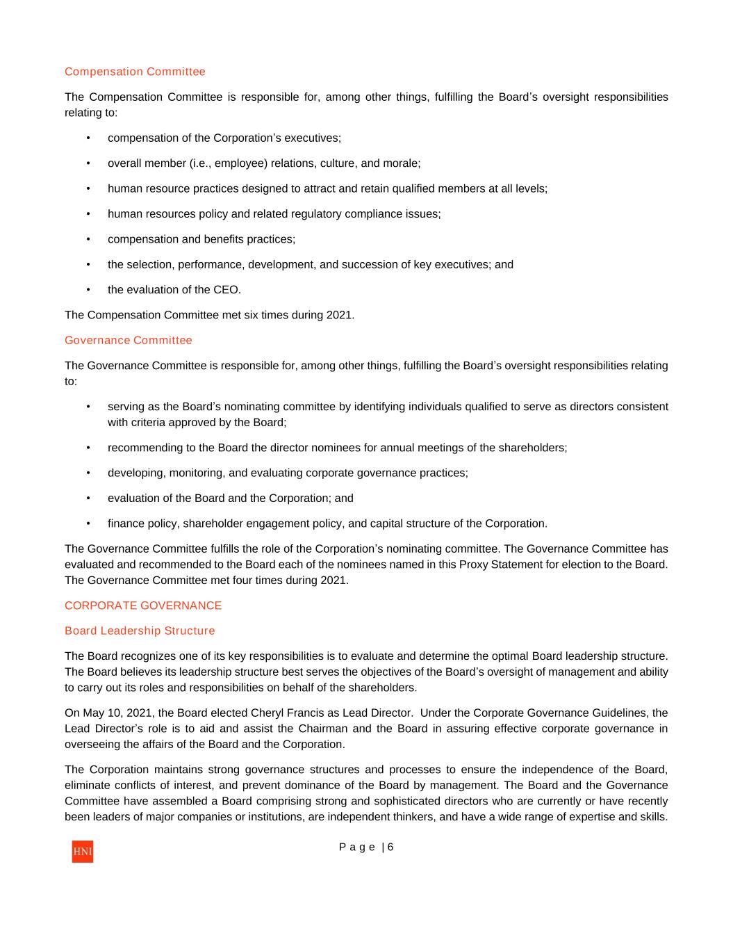 P a g e | 6 Compensation Committee The Compensation Committee is responsible for, among other things, fulfilling the Board’s oversight responsibilities relating to: • compensation of the Corporation’s executives; • overall member (i.e., employee) relations, culture, and morale; • human resource practices designed to attract and retain qualified members at all levels; • human resources policy and related regulatory compliance issues; • compensation and benefits practices; • the selection, performance, development, and succession of key executives; and • the evaluation of the CEO. The Compensation Committee met six times during 2021. Governance Committee The Governance Committee is responsible for, among other things, fulfilling the Board’s oversight responsibilities relating to: • serving as the Board’s nominating committee by identifying individuals qualified to serve as directors consistent with criteria approved by the Board; • recommending to the Board the director nominees for annual meetings of the shareholders; • developing, monitoring, and evaluating corporate governance practices; • evaluation of the Board and the Corporation; and • finance policy, shareholder engagement policy, and capital structure of the Corporation. The Governance Committee fulfills the role of the Corporation’s nominating committee. The Governance Committee has evaluated and recommended to the Board each of the nominees named in this Proxy Statement for election to the Board. The Governance Committee met four times during 2021. CORPORATE GOVERNANCE Board Leadership Structure The Board recognizes one of its key responsibilities is to evaluate and determine the optimal Board leadership structure. The Board believes its leadership structure best serves the objectives of the Board’s oversight of management and ability to carry out its roles and responsibilities on behalf of the shareholders. On May 10, 2021, the Board elected Cheryl Francis as Lead Director. Under the Corporate Governance Guidelines, the Lead Director’s role is to aid and assist the Chairman and the Board in assuring effective corporate governance in overseeing the affairs of the Board and the Corporation. The Corporation maintains strong governance structures and processes to ensure the independence of the Board, eliminate conflicts of interest, and prevent dominance of the Board by management. The Board and the Governance Committee have assembled a Board comprising strong and sophisticated directors who are currently or have recently been leaders of major companies or institutions, are independent thinkers, and have a wide range of expertise and skills.