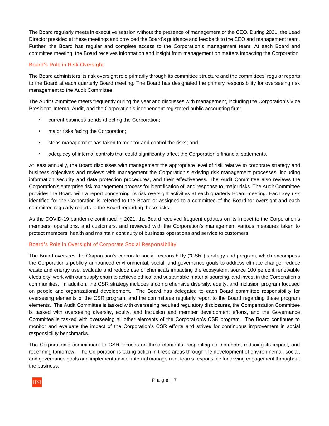P a g e | 7 The Board regularly meets in executive session without the presence of management or the CEO. During 2021, the Lead Director presided at these meetings and provided the Board’s guidance and feedback to the CEO and management team. Further, the Board has regular and complete access to the Corporation’s management team. At each Board and committee meeting, the Board receives information and insight from management on matters impacting the Corporation. Board’s Role in Risk Oversight The Board administers its risk oversight role primarily through its committee structure and the committees’ regular reports to the Board at each quarterly Board meeting. The Board has designated the primary responsibility for overseeing risk management to the Audit Committee. The Audit Committee meets frequently during the year and discusses with management, including the Corporation’s Vice President, Internal Audit, and the Corporation’s independent registered public accounting firm: • current business trends affecting the Corporation; • major risks facing the Corporation; • steps management has taken to monitor and control the risks; and • adequacy of internal controls that could significantly affect the Corporation’s financial statements. At least annually, the Board discusses with management the appropriate level of risk relative to corporate strategy and business objectives and reviews with management the Corporation’s existing risk management processes, including information security and data protection procedures, and their effectiveness. The Audit Committee also reviews the Corporation’s enterprise risk management process for identification of, and response to, major risks. The Audit Committee provides the Board with a report concerning its risk oversight activities at each quarterly Board meeting. Each key risk identified for the Corporation is referred to the Board or assigned to a committee of the Board for oversight and each committee regularly reports to the Board regarding these risks. As the COVID-19 pandemic continued in 2021, the Board received frequent updates on its impact to the Corporation’s members, operations, and customers, and reviewed with the Corporation’s management various measures taken to protect members’ health and maintain continuity of business operations and service to customers. Board’s Role in Oversight of Corporate Social Responsibility The Board oversees the Corporation’s corporate social responsibility (“CSR”) strategy and program, which encompass the Corporation’s publicly announced environmental, social, and governance goals to address climate change, reduce waste and energy use, evaluate and reduce use of chemicals impacting the ecosystem, source 100 percent renewable electricity, work with our supply chain to achieve ethical and sustainable material sourcing, and invest in the Corporation’s communities. In addition, the CSR strategy includes a comprehensive diversity, equity, and inclusion program focused on people and organizational development. The Board has delegated to each Board committee responsibility for overseeing elements of the CSR program, and the committees regularly report to the Board regarding these program elements. The Audit Committee is tasked with overseeing required regulatory disclosures, the Compensation Committee is tasked with overseeing diversity, equity, and inclusion and member development efforts, and the Governance Committee is tasked with overseeing all other elements of the Corporation’s CSR program. The Board continues to monitor and evaluate the impact of the Corporation’s CSR efforts and strives for continuous improvement in social responsibility benchmarks. The Corporation’s commitment to CSR focuses on three elements: respecting its members, reducing its impact, and redefining tomorrow. The Corporation is taking action in these areas through the development of environmental, social, and governance goals and implementation of internal management teams responsible for driving engagement throughout the business.