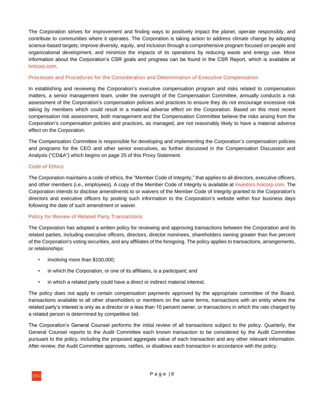 P a g e | 8 The Corporation strives for improvement and finding ways to positively impact the planet, operate responsibly, and contribute to communities where it operates. The Corporation is taking action to address climate change by adopting science-based targets, improve diversity, equity, and inclusion through a comprehensive program focused on people and organizational development, and minimize the impacts of its operations by reducing waste and energy use. More information about the Corporation’s CSR goals and progress can be found in the CSR Report, which is available at hnicorp.com. Processes and Procedures for the Consideration and Determination of Executive Compensation In establishing and reviewing the Corporation’s executive compensation program and risks related to compensation matters, a senior management team, under the oversight of the Compensation Committee, annually conducts a risk assessment of the Corporation’s compensation policies and practices to ensure they do not encourage excessive risk taking by members which could result in a material adverse effect on the Corporation. Based on this most recent compensation risk assessment, both management and the Compensation Committee believe the risks arising from the Corporation’s compensation policies and practices, as managed, are not reasonably likely to have a material adverse effect on the Corporation. The Compensation Committee is responsible for developing and implementing the Corporation’s compensation policies and programs for the CEO and other senior executives, as further discussed in the Compensation Discussion and Analysis (“CD&A”) which begins on page 25 of this Proxy Statement. Code of Ethics The Corporation maintains a code of ethics, the “Member Code of Integrity,” that applies to all directors, executive officers, and other members (i.e., employees). A copy of the Member Code of Integrity is available at investors.hnicorp.com. The Corporation intends to disclose amendments to or waivers of the Member Code of Integrity granted to the Corporation's directors and executive officers by posting such information to the Corporation’s website within four business days following the date of such amendment or waiver. Policy for Review of Related Party Transactions The Corporation has adopted a written policy for reviewing and approving transactions between the Corporation and its related parties, including executive officers, directors, director nominees, shareholders owning greater than five percent of the Corporation's voting securities, and any affiliates of the foregoing. The policy applies to transactions, arrangements, or relationships: • involving more than $100,000; • in which the Corporation, or one of its affiliates, is a participant; and • in which a related party could have a direct or indirect material interest. The policy does not apply to certain compensation payments approved by the appropriate committee of the Board, transactions available to all other shareholders or members on the same terms, transactions with an entity where the related party’s interest is only as a director or a less than 10 percent owner, or transactions in which the rate charged by a related person is determined by competitive bid. The Corporation’s General Counsel performs the initial review of all transactions subject to the policy. Quarterly, the General Counsel reports to the Audit Committee each known transaction to be considered by the Audit Committee pursuant to the policy, including the proposed aggregate value of each transaction and any other relevant information. After review, the Audit Committee approves, ratifies, or disallows each transaction in accordance with the policy.