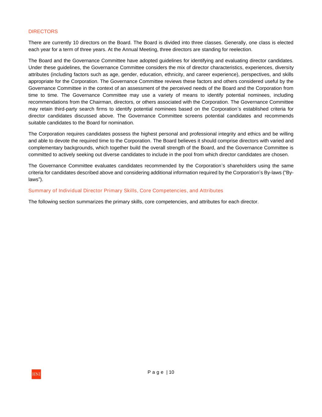 P a g e | 10 DIRECTORS There are currently 10 directors on the Board. The Board is divided into three classes. Generally, one class is elected each year for a term of three years. At the Annual Meeting, three directors are standing for reelection. The Board and the Governance Committee have adopted guidelines for identifying and evaluating director candidates. Under these guidelines, the Governance Committee considers the mix of director characteristics, experiences, diversity attributes (including factors such as age, gender, education, ethnicity, and career experience), perspectives, and skills appropriate for the Corporation. The Governance Committee reviews these factors and others considered useful by the Governance Committee in the context of an assessment of the perceived needs of the Board and the Corporation from time to time. The Governance Committee may use a variety of means to identify potential nominees, including recommendations from the Chairman, directors, or others associated with the Corporation. The Governance Committee may retain third-party search firms to identify potential nominees based on the Corporation’s established criteria for director candidates discussed above. The Governance Committee screens potential candidates and recommends suitable candidates to the Board for nomination. The Corporation requires candidates possess the highest personal and professional integrity and ethics and be willing and able to devote the required time to the Corporation. The Board believes it should comprise directors with varied and complementary backgrounds, which together build the overall strength of the Board, and the Governance Committee is committed to actively seeking out diverse candidates to include in the pool from which director candidates are chosen. The Governance Committee evaluates candidates recommended by the Corporation’s shareholders using the same criteria for candidates described above and considering additional information required by the Corporation’s By-laws (“By- laws”). Summary of Individual Director Primary Skills, Core Competencies, and Attributes The following section summarizes the primary skills, core competencies, and attributes for each director.