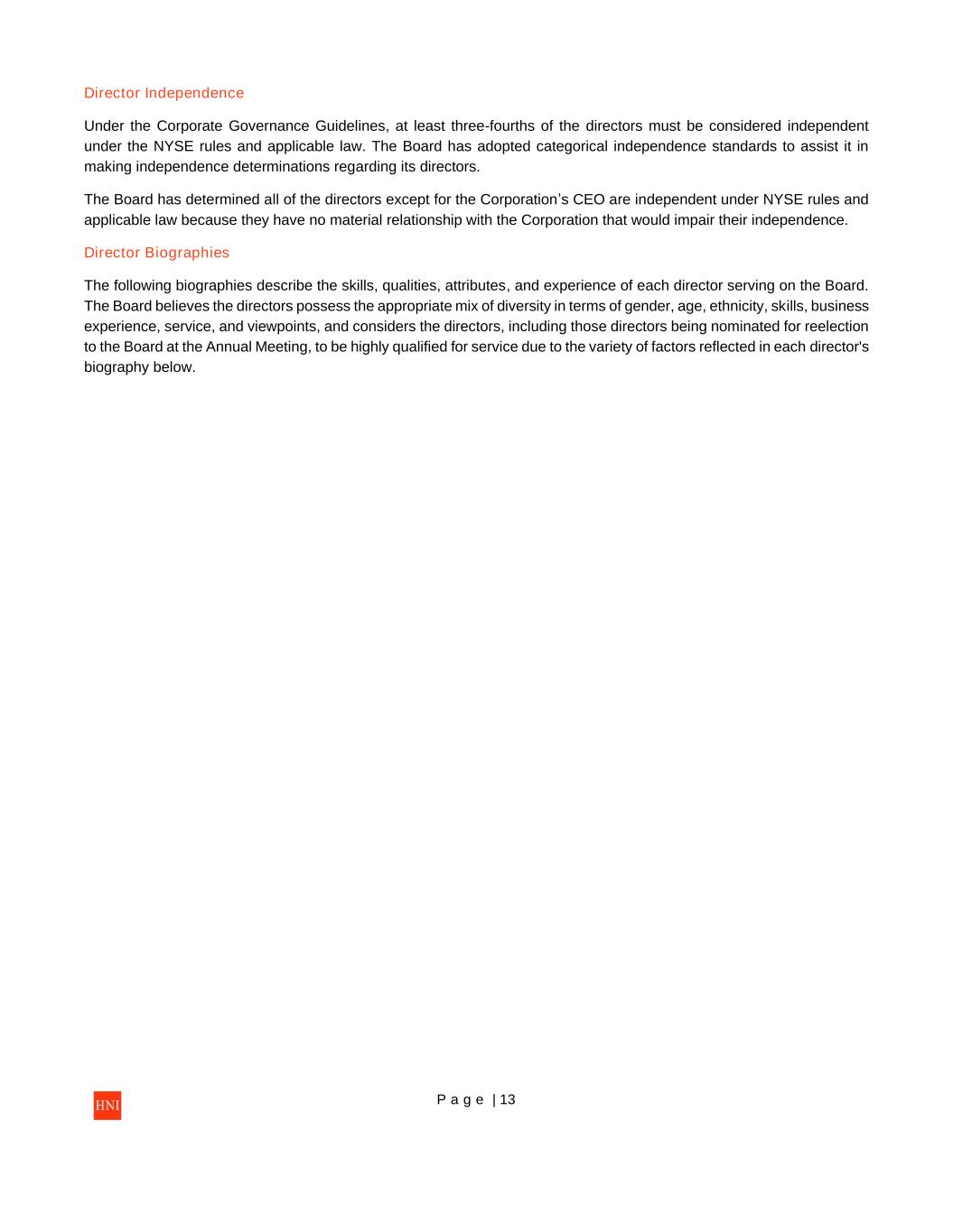 P a g e | 13 Director Independence Under the Corporate Governance Guidelines, at least three-fourths of the directors must be considered independent under the NYSE rules and applicable law. The Board has adopted categorical independence standards to assist it in making independence determinations regarding its directors. The Board has determined all of the directors except for the Corporation’s CEO are independent under NYSE rules and applicable law because they have no material relationship with the Corporation that would impair their independence. Director Biographies The following biographies describe the skills, qualities, attributes, and experience of each director serving on the Board. The Board believes the directors possess the appropriate mix of diversity in terms of gender, age, ethnicity, skills, business experience, service, and viewpoints, and considers the directors, including those directors being nominated for reelection to the Board at the Annual Meeting, to be highly qualified for service due to the variety of factors reflected in each director's biography below.