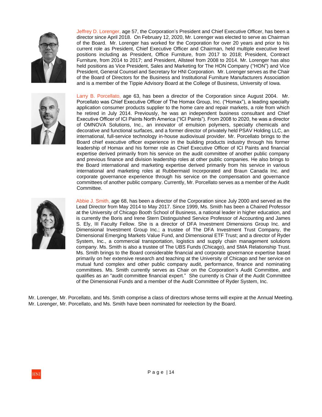 P a g e | 14 Jeffrey D. Lorenger, age 57, the Corporation’s President and Chief Executive Officer, has been a director since April 2018. On February 12, 2020, Mr. Lorenger was elected to serve as Chairman of the Board. Mr. Lorenger has worked for the Corporation for over 20 years and prior to his current role as President, Chief Executive Officer and Chairman, held multiple executive level positions including as President, Office Furniture, from 2017 to 2018; President, Contract Furniture, from 2014 to 2017; and President, Allsteel from 2008 to 2014. Mr. Lorenger has also held positions as Vice President, Sales and Marketing for The HON Company (“HON”) and Vice President, General Counsel and Secretary for HNI Corporation. Mr. Lorenger serves as the Chair of the Board of Directors for the Business and Institutional Furniture Manufacturers Association and is a member of the Tippie Advisory Board at the College of Business, University of Iowa. Larry B. Porcellato, age 63, has been a director of the Corporation since August 2004. Mr. Porcellato was Chief Executive Officer of The Homax Group, Inc. (“Homax”), a leading specialty application consumer products supplier to the home care and repair markets, a role from which he retired in July 2014. Previously, he was an independent business consultant and Chief Executive Officer of ICI Paints North America (“ICI Paints”). From 2008 to 2020, he was a director of OMNOVA Solutions, Inc., an innovator of emulsion polymers, specialty chemicals and decorative and functional surfaces, and a former director of privately held PSAV Holding LLC, an international, full-service technology in-house audiovisual provider. Mr. Porcellato brings to the Board chief executive officer experience in the building products industry through his former leadership of Homax and his former role as Chief Executive Officer of ICI Paints and financial expertise derived primarily from his service on the audit committee of another public company and previous finance and division leadership roles at other public companies. He also brings to the Board international and marketing expertise derived primarily from his service in various international and marketing roles at Rubbermaid Incorporated and Braun Canada Inc. and corporate governance experience through his service on the compensation and governance committees of another public company. Currently, Mr. Porcellato serves as a member of the Audit Committee. Abbie J. Smith, age 68, has been a director of the Corporation since July 2000 and served as the Lead Director from May 2014 to May 2017. Since 1999, Ms. Smith has been a Chaired Professor at the University of Chicago Booth School of Business, a national leader in higher education, and is currently the Boris and Irene Stern Distinguished Service Professor of Accounting and James S. Ely, III Faculty Fellow. She is a director of DFA Investment Dimensions Group Inc. and Dimensional Investment Group Inc.; a trustee of The DFA Investment Trust Company, the Dimensional Emerging Markets Value Fund, and Dimensional ETF Trust; and a director of Ryder System, Inc., a commercial transportation, logistics and supply chain management solutions company. Ms. Smith is also a trustee of The UBS Funds (Chicago), and SMA Relationship Trust. Ms. Smith brings to the Board considerable financial and corporate governance expertise based primarily on her extensive research and teaching at the University of Chicago and her service on mutual fund complex and other public company audit, performance, finance and nominating committees. Ms. Smith currently serves as Chair on the Corporation’s Audit Committee, and qualifies as an “audit committee financial expert.” She currently is Chair of the Audit Committee of the Dimensional Funds and a member of the Audit Committee of Ryder System, Inc. Mr. Lorenger, Mr. Porcellato, and Ms. Smith comprise a class of directors whose terms will expire at the Annual Meeting. Mr. Lorenger, Mr. Porcellato, and Ms. Smith have been nominated for reelection by the Board.