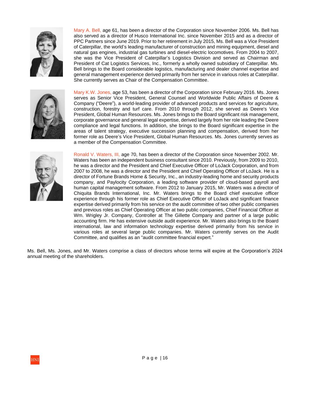 P a g e | 16 Mary A. Bell, age 61, has been a director of the Corporation since November 2006. Ms. Bell has also served as a director of Husco International Inc. since November 2015 and as a director of PPC Partners since June 2019. Prior to her retirement in July 2015, Ms. Bell was a Vice President of Caterpillar, the world’s leading manufacturer of construction and mining equipment, diesel and natural gas engines, industrial gas turbines and diesel-electric locomotives. From 2004 to 2007, she was the Vice President of Caterpillar’s Logistics Division and served as Chairman and President of Cat Logistics Services, Inc., formerly a wholly owned subsidiary of Caterpillar. Ms. Bell brings to the Board considerable logistics, manufacturing and dealer channel expertise and general management experience derived primarily from her service in various roles at Caterpillar. She currently serves as Chair of the Compensation Committee. Mary K.W. Jones, age 53, has been a director of the Corporation since February 2016. Ms. Jones serves as Senior Vice President, General Counsel and Worldwide Public Affairs of Deere & Company (“Deere”), a world-leading provider of advanced products and services for agriculture, construction, forestry and turf care. From 2010 through 2012, she served as Deere's Vice President, Global Human Resources. Ms. Jones brings to the Board significant risk management, corporate governance and general legal expertise, derived largely from her role leading the Deere compliance and legal functions. In addition, she brings to the Board significant expertise in the areas of talent strategy, executive succession planning and compensation, derived from her former role as Deere’s Vice President, Global Human Resources. Ms. Jones currently serves as a member of the Compensation Committee. Ronald V. Waters, III, age 70, has been a director of the Corporation since November 2002. Mr. Waters has been an independent business consultant since 2010. Previously, from 2009 to 2010, he was a director and the President and Chief Executive Officer of LoJack Corporation, and from 2007 to 2008, he was a director and the President and Chief Operating Officer of LoJack. He is a director of Fortune Brands Home & Security, Inc., an industry-leading home and security products company, and Paylocity Corporation, a leading software provider of cloud-based payroll and human capital management software. From 2012 to January 2015, Mr. Waters was a director of Chiquita Brands International, Inc. Mr. Waters brings to the Board chief executive officer experience through his former role as Chief Executive Officer of LoJack and significant finance expertise derived primarily from his service on the audit committee of two other public companies and previous roles as Chief Operating Officer at two public companies, Chief Financial Officer at Wm. Wrigley Jr. Company, Controller at The Gillette Company and partner of a large public accounting firm. He has extensive outside audit experience. Mr. Waters also brings to the Board international, law and information technology expertise derived primarily from his service in various roles at several large public companies. Mr. Waters currently serves on the Audit Committee, and qualifies as an “audit committee financial expert.” Ms. Bell, Ms. Jones, and Mr. Waters comprise a class of directors whose terms will expire at the Corporation’s 2024 annual meeting of the shareholders.
