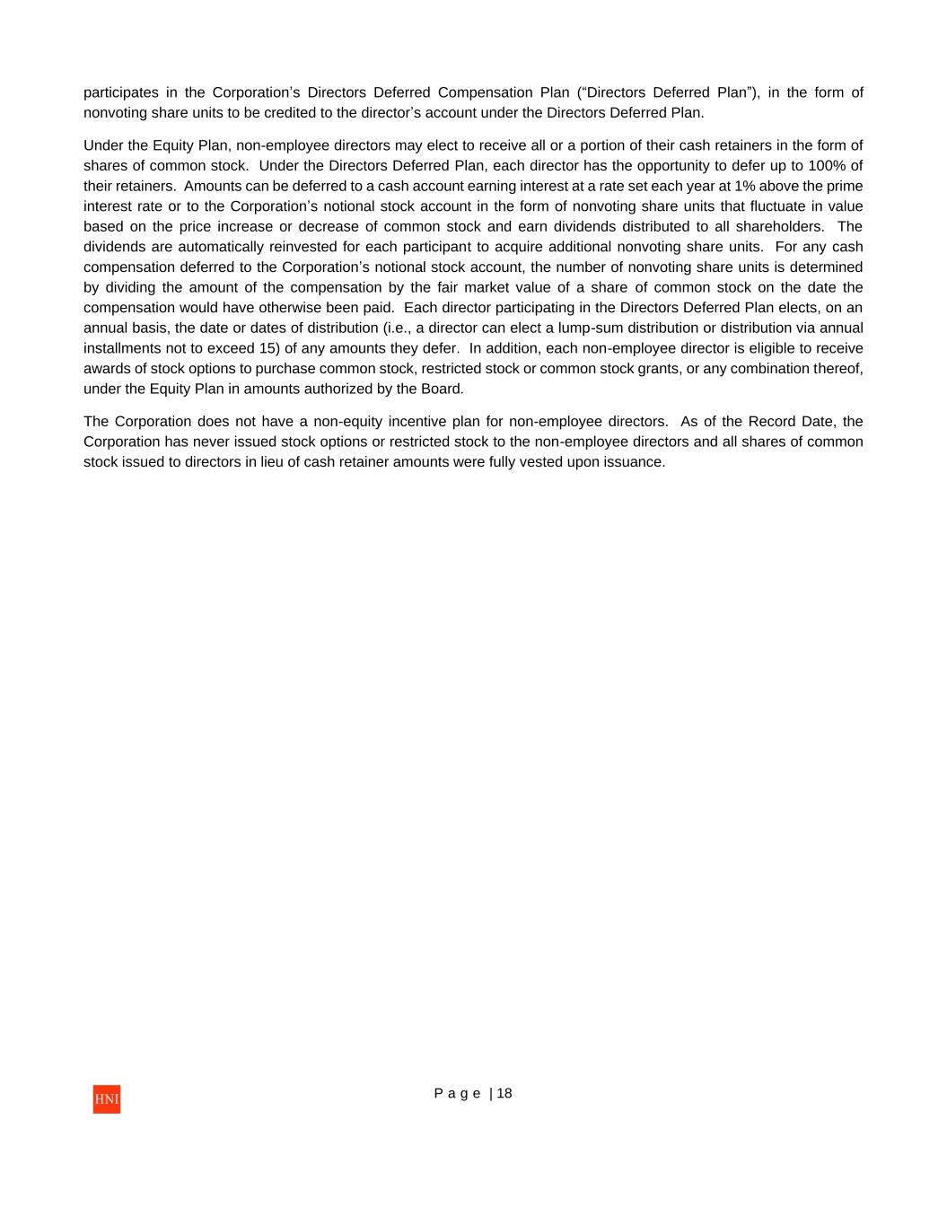 P a g e | 18 participates in the Corporation’s Directors Deferred Compensation Plan (“Directors Deferred Plan”), in the form of nonvoting share units to be credited to the director’s account under the Directors Deferred Plan. Under the Equity Plan, non-employee directors may elect to receive all or a portion of their cash retainers in the form of shares of common stock. Under the Directors Deferred Plan, each director has the opportunity to defer up to 100% of their retainers. Amounts can be deferred to a cash account earning interest at a rate set each year at 1% above the prime interest rate or to the Corporation’s notional stock account in the form of nonvoting share units that fluctuate in value based on the price increase or decrease of common stock and earn dividends distributed to all shareholders. The dividends are automatically reinvested for each participant to acquire additional nonvoting share units. For any cash compensation deferred to the Corporation’s notional stock account, the number of nonvoting share units is determined by dividing the amount of the compensation by the fair market value of a share of common stock on the date the compensation would have otherwise been paid. Each director participating in the Directors Deferred Plan elects, on an annual basis, the date or dates of distribution (i.e., a director can elect a lump-sum distribution or distribution via annual installments not to exceed 15) of any amounts they defer. In addition, each non-employee director is eligible to receive awards of stock options to purchase common stock, restricted stock or common stock grants, or any combination thereof, under the Equity Plan in amounts authorized by the Board. The Corporation does not have a non-equity incentive plan for non-employee directors. As of the Record Date, the Corporation has never issued stock options or restricted stock to the non-employee directors and all shares of common stock issued to directors in lieu of cash retainer amounts were fully vested upon issuance.