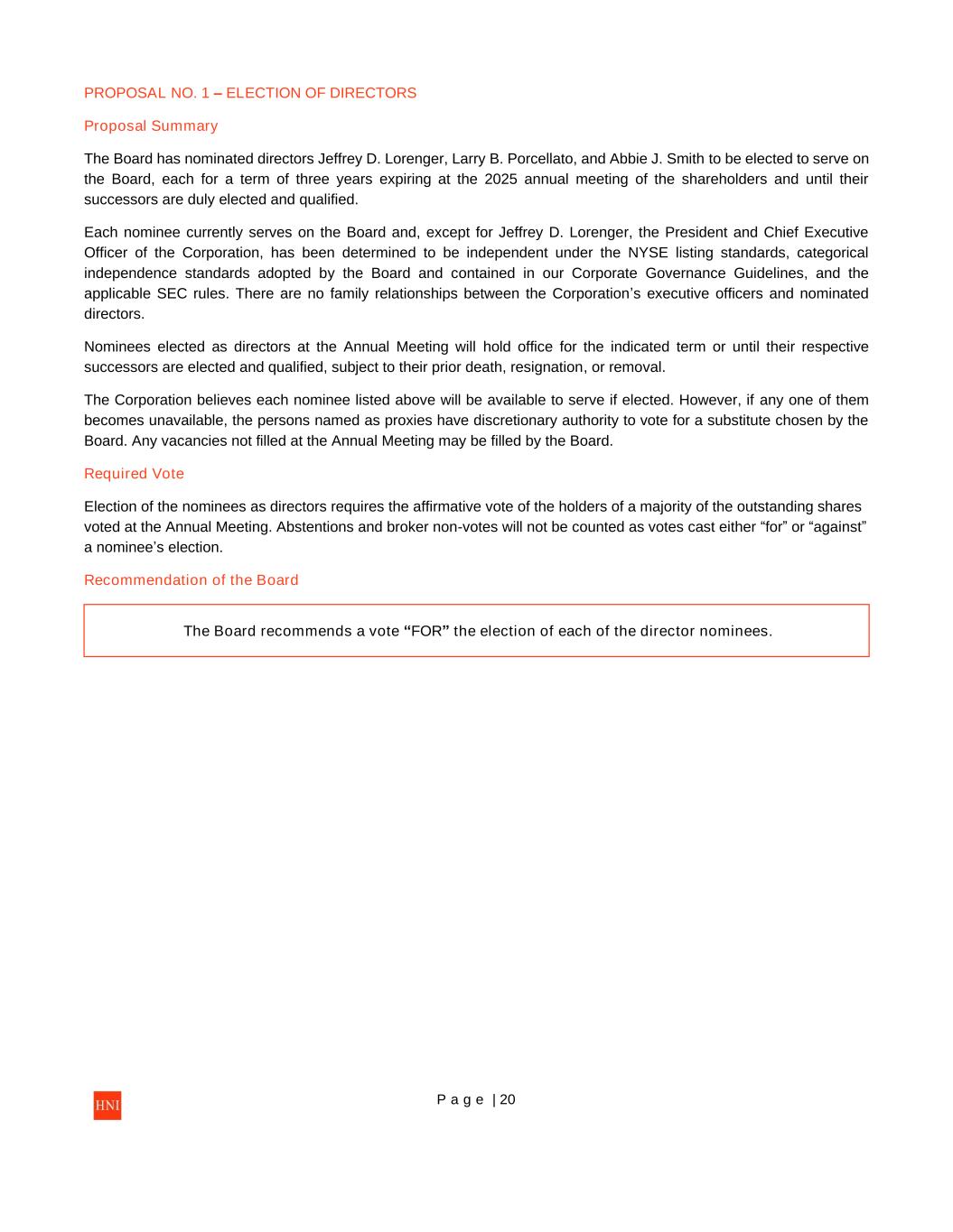 P a g e | 20 PROPOSAL NO. 1 – ELECTION OF DIRECTORS Proposal Summary The Board has nominated directors Jeffrey D. Lorenger, Larry B. Porcellato, and Abbie J. Smith to be elected to serve on the Board, each for a term of three years expiring at the 2025 annual meeting of the shareholders and until their successors are duly elected and qualified. Each nominee currently serves on the Board and, except for Jeffrey D. Lorenger, the President and Chief Executive Officer of the Corporation, has been determined to be independent under the NYSE listing standards, categorical independence standards adopted by the Board and contained in our Corporate Governance Guidelines, and the applicable SEC rules. There are no family relationships between the Corporation’s executive officers and nominated directors. Nominees elected as directors at the Annual Meeting will hold office for the indicated term or until their respective successors are elected and qualified, subject to their prior death, resignation, or removal. The Corporation believes each nominee listed above will be available to serve if elected. However, if any one of them becomes unavailable, the persons named as proxies have discretionary authority to vote for a substitute chosen by the Board. Any vacancies not filled at the Annual Meeting may be filled by the Board. Required Vote Election of the nominees as directors requires the affirmative vote of the holders of a majority of the outstanding shares voted at the Annual Meeting. Abstentions and broker non-votes will not be counted as votes cast either “for” or “against” a nominee’s election. Recommendation of the Board The Board recommends a vote “FOR” the election of each of the director nominees.