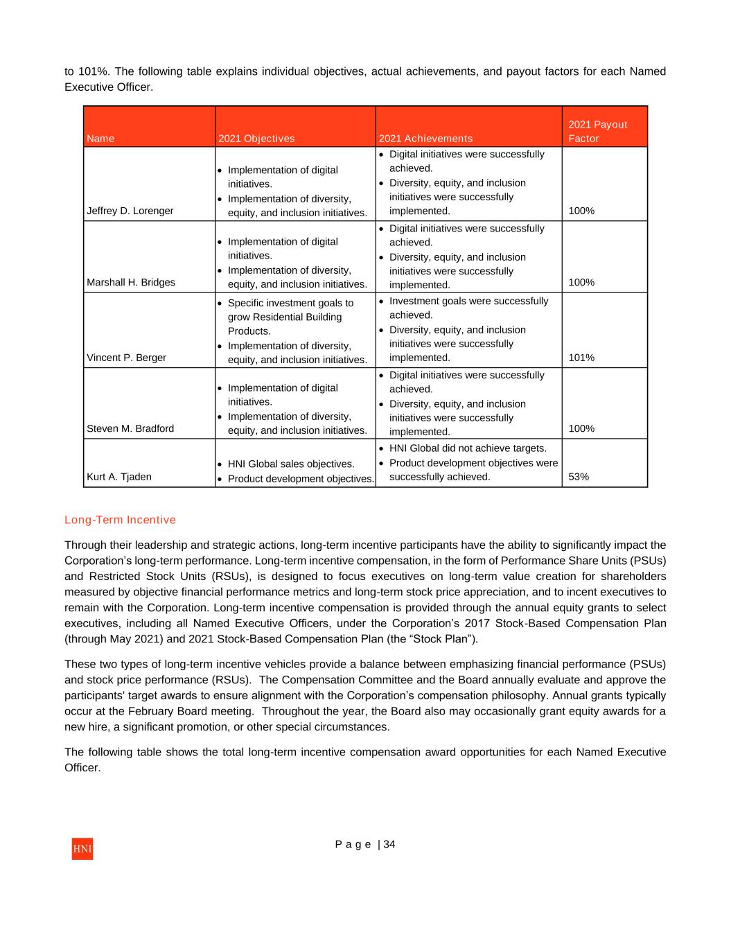 P a g e | 34 to 101%. The following table explains individual objectives, actual achievements, and payout factors for each Named Executive Officer. Name 2021 Objectives 2021 Achievements 2021 Payout Factor Jeffrey D. Lorenger • Implementation of digital initiatives. • Implementation of diversity, equity, and inclusion initiatives. • Digital initiatives were successfully achieved. • Diversity, equity, and inclusion initiatives were successfully implemented. • 100% Marshall H. Bridges • Implementation of digital initiatives. • Implementation of diversity, equity, and inclusion initiatives. • Digital initiatives were successfully achieved. • Diversity, equity, and inclusion initiatives were successfully implemented. 100% Vincent P. Berger • Specific investment goals to grow Residential Building Products. • Implementation of diversity, equity, and inclusion initiatives. • Investment goals were successfully achieved. • Diversity, equity, and inclusion initiatives were successfully implemented. 101% Steven M. Bradford • Implementation of digital initiatives. • Implementation of diversity, equity, and inclusion initiatives. • Digital initiatives were successfully achieved. • Diversity, equity, and inclusion initiatives were successfully implemented. 100% Kurt A. Tjaden • HNI Global sales objectives. • Product development objectives. • HNI Global did not achieve targets. • Product development objectives were successfully achieved. 53% Long-Term Incentive Through their leadership and strategic actions, long-term incentive participants have the ability to significantly impact the Corporation’s long-term performance. Long-term incentive compensation, in the form of Performance Share Units (PSUs) and Restricted Stock Units (RSUs), is designed to focus executives on long-term value creation for shareholders measured by objective financial performance metrics and long-term stock price appreciation, and to incent executives to remain with the Corporation. Long-term incentive compensation is provided through the annual equity grants to select executives, including all Named Executive Officers, under the Corporation’s 2017 Stock-Based Compensation Plan (through May 2021) and 2021 Stock-Based Compensation Plan (the “Stock Plan”). These two types of long-term incentive vehicles provide a balance between emphasizing financial performance (PSUs) and stock price performance (RSUs). The Compensation Committee and the Board annually evaluate and approve the participants' target awards to ensure alignment with the Corporation’s compensation philosophy. Annual grants typically occur at the February Board meeting. Throughout the year, the Board also may occasionally grant equity awards for a new hire, a significant promotion, or other special circumstances. The following table shows the total long-term incentive compensation award opportunities for each Named Executive Officer.