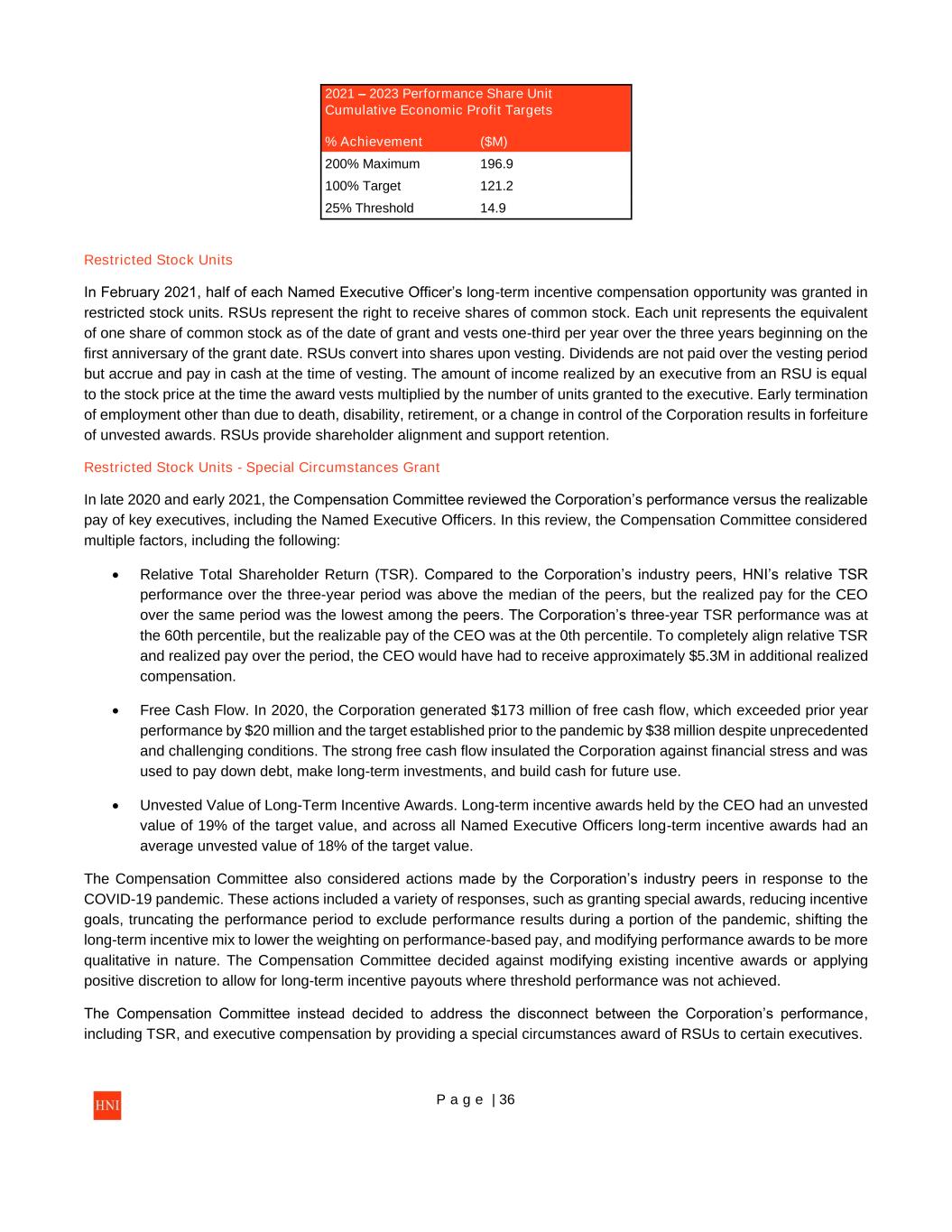 P a g e | 36 2021 – 2023 Performance Share Unit Cumulative Economic Profit Targets % Achievement ($M) 200% Maximum 196.9 100% Target 121.2 25% Threshold 14.9 Restricted Stock Units In February 2021, half of each Named Executive Officer’s long-term incentive compensation opportunity was granted in restricted stock units. RSUs represent the right to receive shares of common stock. Each unit represents the equivalent of one share of common stock as of the date of grant and vests one-third per year over the three years beginning on the first anniversary of the grant date. RSUs convert into shares upon vesting. Dividends are not paid over the vesting period but accrue and pay in cash at the time of vesting. The amount of income realized by an executive from an RSU is equal to the stock price at the time the award vests multiplied by the number of units granted to the executive. Early termination of employment other than due to death, disability, retirement, or a change in control of the Corporation results in forfeiture of unvested awards. RSUs provide shareholder alignment and support retention. Restricted Stock Units - Special Circumstances Grant In late 2020 and early 2021, the Compensation Committee reviewed the Corporation’s performance versus the realizable pay of key executives, including the Named Executive Officers. In this review, the Compensation Committee considered multiple factors, including the following: • Relative Total Shareholder Return (TSR). Compared to the Corporation’s industry peers, HNI’s relative TSR performance over the three-year period was above the median of the peers, but the realized pay for the CEO over the same period was the lowest among the peers. The Corporation’s three-year TSR performance was at the 60th percentile, but the realizable pay of the CEO was at the 0th percentile. To completely align relative TSR and realized pay over the period, the CEO would have had to receive approximately $5.3M in additional realized compensation. • Free Cash Flow. In 2020, the Corporation generated $173 million of free cash flow, which exceeded prior year performance by $20 million and the target established prior to the pandemic by $38 million despite unprecedented and challenging conditions. The strong free cash flow insulated the Corporation against financial stress and was used to pay down debt, make long-term investments, and build cash for future use. • Unvested Value of Long-Term Incentive Awards. Long-term incentive awards held by the CEO had an unvested value of 19% of the target value, and across all Named Executive Officers long-term incentive awards had an average unvested value of 18% of the target value. The Compensation Committee also considered actions made by the Corporation’s industry peers in response to the COVID-19 pandemic. These actions included a variety of responses, such as granting special awards, reducing incentive goals, truncating the performance period to exclude performance results during a portion of the pandemic, shifting the long-term incentive mix to lower the weighting on performance-based pay, and modifying performance awards to be more qualitative in nature. The Compensation Committee decided against modifying existing incentive awards or applying positive discretion to allow for long-term incentive payouts where threshold performance was not achieved. The Compensation Committee instead decided to address the disconnect between the Corporation’s performance, including TSR, and executive compensation by providing a special circumstances award of RSUs to certain executives.