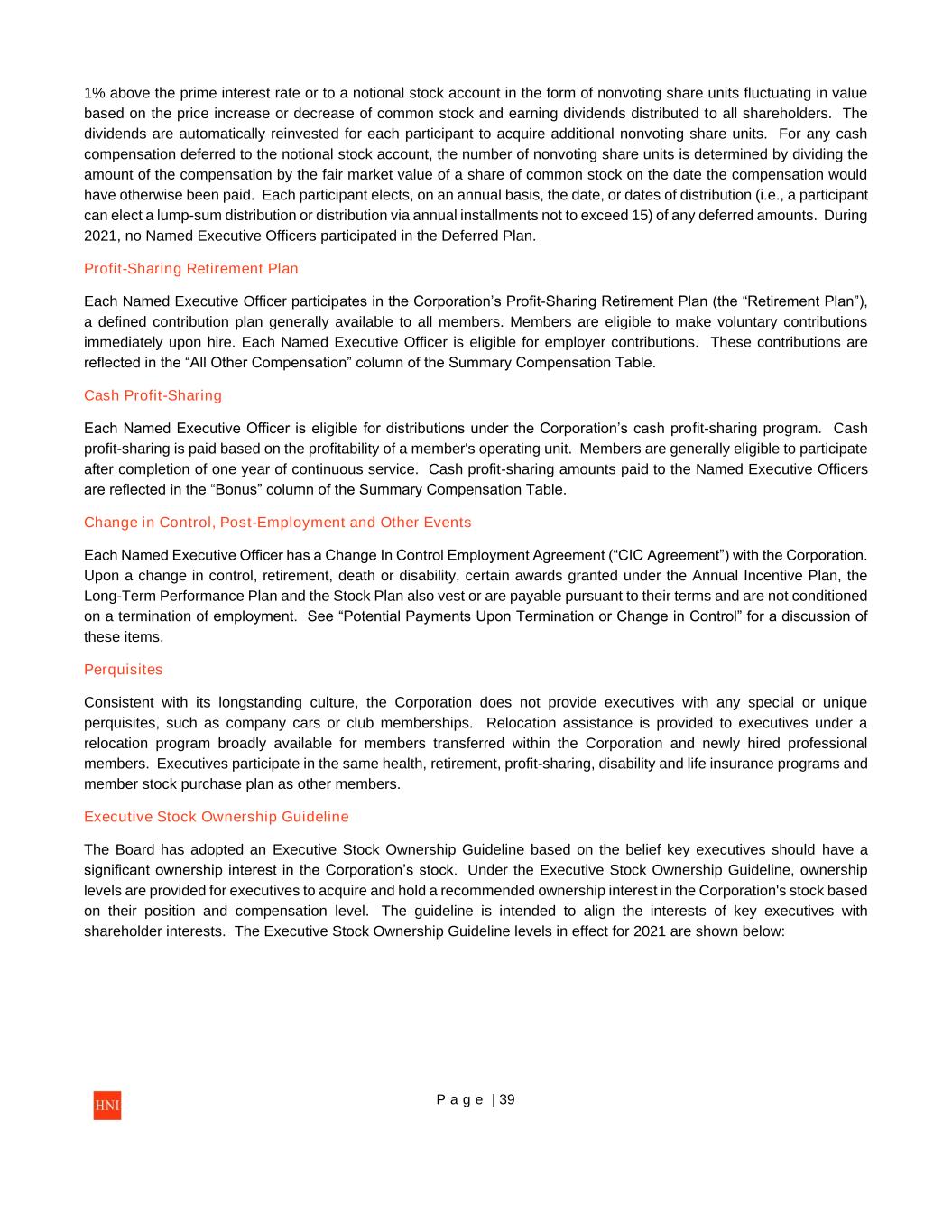 P a g e | 39 1% above the prime interest rate or to a notional stock account in the form of nonvoting share units fluctuating in value based on the price increase or decrease of common stock and earning dividends distributed to all shareholders. The dividends are automatically reinvested for each participant to acquire additional nonvoting share units. For any cash compensation deferred to the notional stock account, the number of nonvoting share units is determined by dividing the amount of the compensation by the fair market value of a share of common stock on the date the compensation would have otherwise been paid. Each participant elects, on an annual basis, the date, or dates of distribution (i.e., a participant can elect a lump-sum distribution or distribution via annual installments not to exceed 15) of any deferred amounts. During 2021, no Named Executive Officers participated in the Deferred Plan. Profit-Sharing Retirement Plan Each Named Executive Officer participates in the Corporation’s Profit-Sharing Retirement Plan (the “Retirement Plan”), a defined contribution plan generally available to all members. Members are eligible to make voluntary contributions immediately upon hire. Each Named Executive Officer is eligible for employer contributions. These contributions are reflected in the “All Other Compensation” column of the Summary Compensation Table. Cash Profit-Sharing Each Named Executive Officer is eligible for distributions under the Corporation’s cash profit-sharing program. Cash profit-sharing is paid based on the profitability of a member's operating unit. Members are generally eligible to participate after completion of one year of continuous service. Cash profit-sharing amounts paid to the Named Executive Officers are reflected in the “Bonus” column of the Summary Compensation Table. Change in Control, Post-Employment and Other Events Each Named Executive Officer has a Change In Control Employment Agreement (“CIC Agreement”) with the Corporation. Upon a change in control, retirement, death or disability, certain awards granted under the Annual Incentive Plan, the Long-Term Performance Plan and the Stock Plan also vest or are payable pursuant to their terms and are not conditioned on a termination of employment. See “Potential Payments Upon Termination or Change in Control” for a discussion of these items. Perquisites Consistent with its longstanding culture, the Corporation does not provide executives with any special or unique perquisites, such as company cars or club memberships. Relocation assistance is provided to executives under a relocation program broadly available for members transferred within the Corporation and newly hired professional members. Executives participate in the same health, retirement, profit-sharing, disability and life insurance programs and member stock purchase plan as other members. Executive Stock Ownership Guideline The Board has adopted an Executive Stock Ownership Guideline based on the belief key executives should have a significant ownership interest in the Corporation’s stock. Under the Executive Stock Ownership Guideline, ownership levels are provided for executives to acquire and hold a recommended ownership interest in the Corporation's stock based on their position and compensation level. The guideline is intended to align the interests of key executives with shareholder interests. The Executive Stock Ownership Guideline levels in effect for 2021 are shown below: