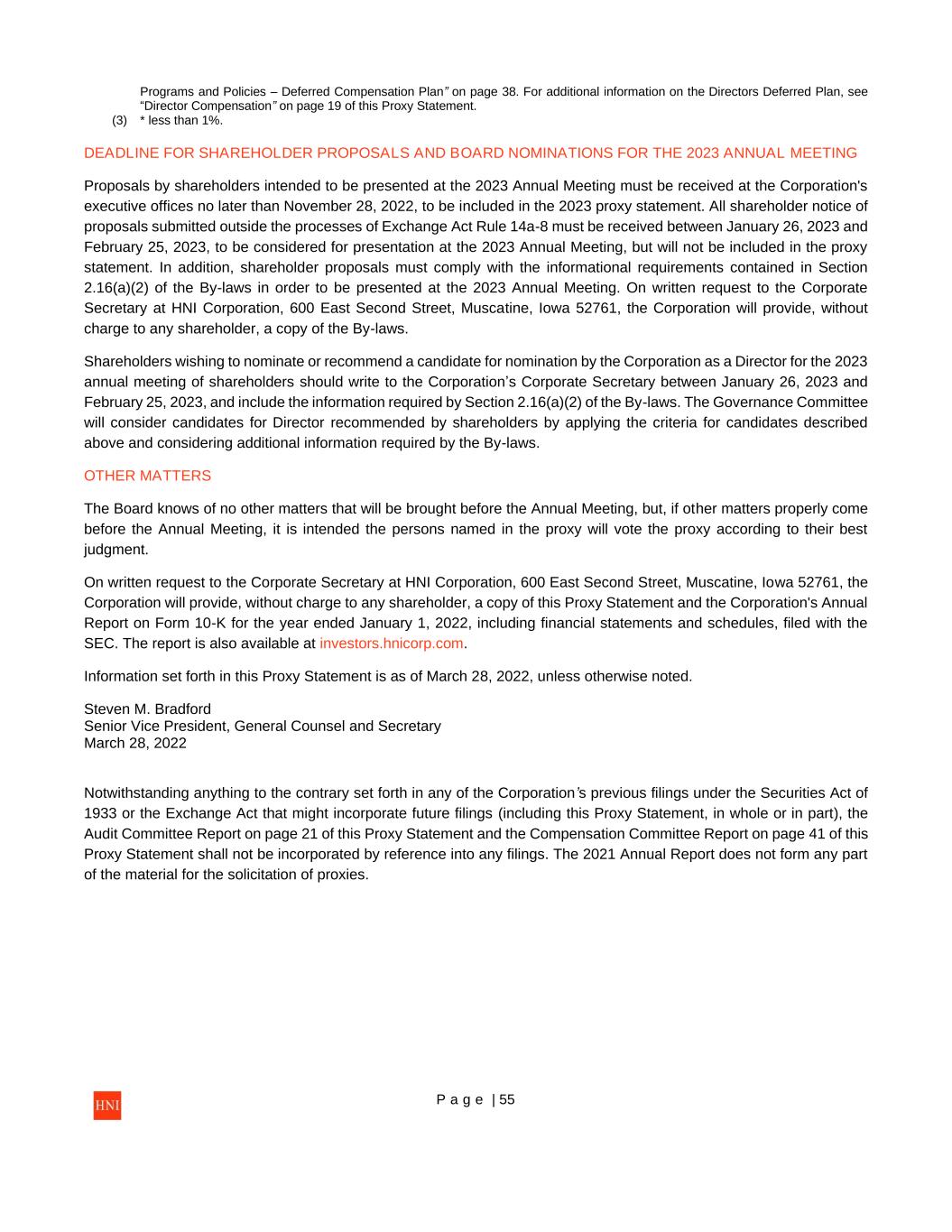 P a g e | 55 Programs and Policies – Deferred Compensation Plan” on page 38. For additional information on the Directors Deferred Plan, see “Director Compensation” on page 19 of this Proxy Statement. (3) * less than 1%. DEADLINE FOR SHAREHOLDER PROPOSALS AND BOARD NOMINATIONS FOR THE 2023 ANNUAL MEETING Proposals by shareholders intended to be presented at the 2023 Annual Meeting must be received at the Corporation's executive offices no later than November 28, 2022, to be included in the 2023 proxy statement. All shareholder notice of proposals submitted outside the processes of Exchange Act Rule 14a-8 must be received between January 26, 2023 and February 25, 2023, to be considered for presentation at the 2023 Annual Meeting, but will not be included in the proxy statement. In addition, shareholder proposals must comply with the informational requirements contained in Section 2.16(a)(2) of the By-laws in order to be presented at the 2023 Annual Meeting. On written request to the Corporate Secretary at HNI Corporation, 600 East Second Street, Muscatine, Iowa 52761, the Corporation will provide, without charge to any shareholder, a copy of the By-laws. Shareholders wishing to nominate or recommend a candidate for nomination by the Corporation as a Director for the 2023 annual meeting of shareholders should write to the Corporation’s Corporate Secretary between January 26, 2023 and February 25, 2023, and include the information required by Section 2.16(a)(2) of the By-laws. The Governance Committee will consider candidates for Director recommended by shareholders by applying the criteria for candidates described above and considering additional information required by the By-laws. OTHER MATTERS The Board knows of no other matters that will be brought before the Annual Meeting, but, if other matters properly come before the Annual Meeting, it is intended the persons named in the proxy will vote the proxy according to their best judgment. On written request to the Corporate Secretary at HNI Corporation, 600 East Second Street, Muscatine, Iowa 52761, the Corporation will provide, without charge to any shareholder, a copy of this Proxy Statement and the Corporation's Annual Report on Form 10-K for the year ended January 1, 2022, including financial statements and schedules, filed with the SEC. The report is also available at investors.hnicorp.com. Information set forth in this Proxy Statement is as of March 28, 2022, unless otherwise noted. Steven M. Bradford Senior Vice President, General Counsel and Secretary March 28, 2022 Notwithstanding anything to the contrary set forth in any of the Corporation’s previous filings under the Securities Act of 1933 or the Exchange Act that might incorporate future filings (including this Proxy Statement, in whole or in part), the Audit Committee Report on page 21 of this Proxy Statement and the Compensation Committee Report on page 41 of this Proxy Statement shall not be incorporated by reference into any filings. The 2021 Annual Report does not form any part of the material for the solicitation of proxies.