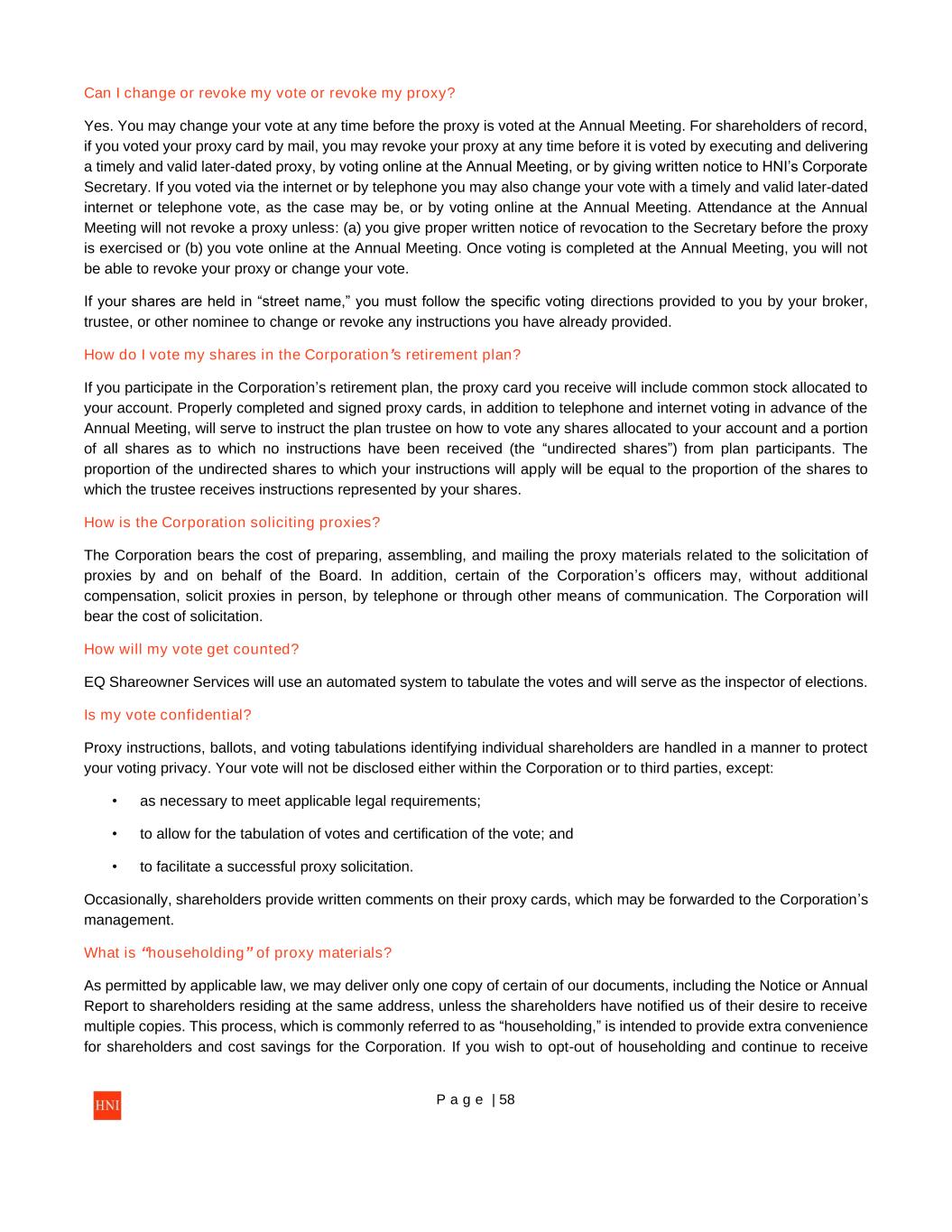 P a g e | 58 Can I change or revoke my vote or revoke my proxy? Yes. You may change your vote at any time before the proxy is voted at the Annual Meeting. For shareholders of record, if you voted your proxy card by mail, you may revoke your proxy at any time before it is voted by executing and delivering a timely and valid later-dated proxy, by voting online at the Annual Meeting, or by giving written notice to HNI’s Corporate Secretary. If you voted via the internet or by telephone you may also change your vote with a timely and valid later-dated internet or telephone vote, as the case may be, or by voting online at the Annual Meeting. Attendance at the Annual Meeting will not revoke a proxy unless: (a) you give proper written notice of revocation to the Secretary before the proxy is exercised or (b) you vote online at the Annual Meeting. Once voting is completed at the Annual Meeting, you will not be able to revoke your proxy or change your vote. If your shares are held in “street name,” you must follow the specific voting directions provided to you by your broker, trustee, or other nominee to change or revoke any instructions you have already provided. How do I vote my shares in the Corporation’s retirement plan? If you participate in the Corporation’s retirement plan, the proxy card you receive will include common stock allocated to your account. Properly completed and signed proxy cards, in addition to telephone and internet voting in advance of the Annual Meeting, will serve to instruct the plan trustee on how to vote any shares allocated to your account and a portion of all shares as to which no instructions have been received (the “undirected shares”) from plan participants. The proportion of the undirected shares to which your instructions will apply will be equal to the proportion of the shares to which the trustee receives instructions represented by your shares. How is the Corporation soliciting proxies? The Corporation bears the cost of preparing, assembling, and mailing the proxy materials related to the solicitation of proxies by and on behalf of the Board. In addition, certain of the Corporation’s officers may, without additional compensation, solicit proxies in person, by telephone or through other means of communication. The Corporation will bear the cost of solicitation. How will my vote get counted? EQ Shareowner Services will use an automated system to tabulate the votes and will serve as the inspector of elections. Is my vote confidential? Proxy instructions, ballots, and voting tabulations identifying individual shareholders are handled in a manner to protect your voting privacy. Your vote will not be disclosed either within the Corporation or to third parties, except: • as necessary to meet applicable legal requirements; • to allow for the tabulation of votes and certification of the vote; and • to facilitate a successful proxy solicitation. Occasionally, shareholders provide written comments on their proxy cards, which may be forwarded to the Corporation’s management. What is “householding” of proxy materials? As permitted by applicable law, we may deliver only one copy of certain of our documents, including the Notice or Annual Report to shareholders residing at the same address, unless the shareholders have notified us of their desire to receive multiple copies. This process, which is commonly referred to as “householding,” is intended to provide extra convenience for shareholders and cost savings for the Corporation. If you wish to opt-out of householding and continue to receive