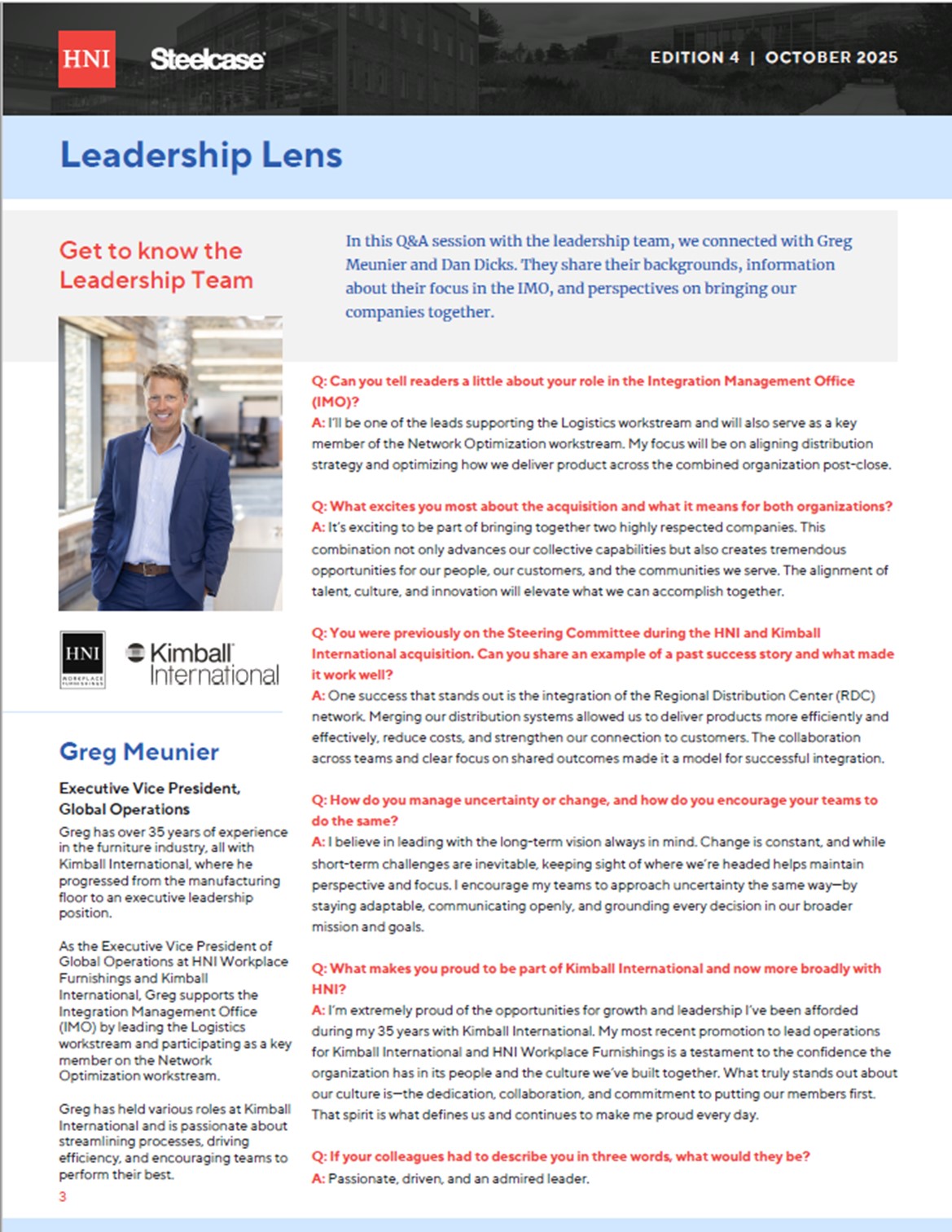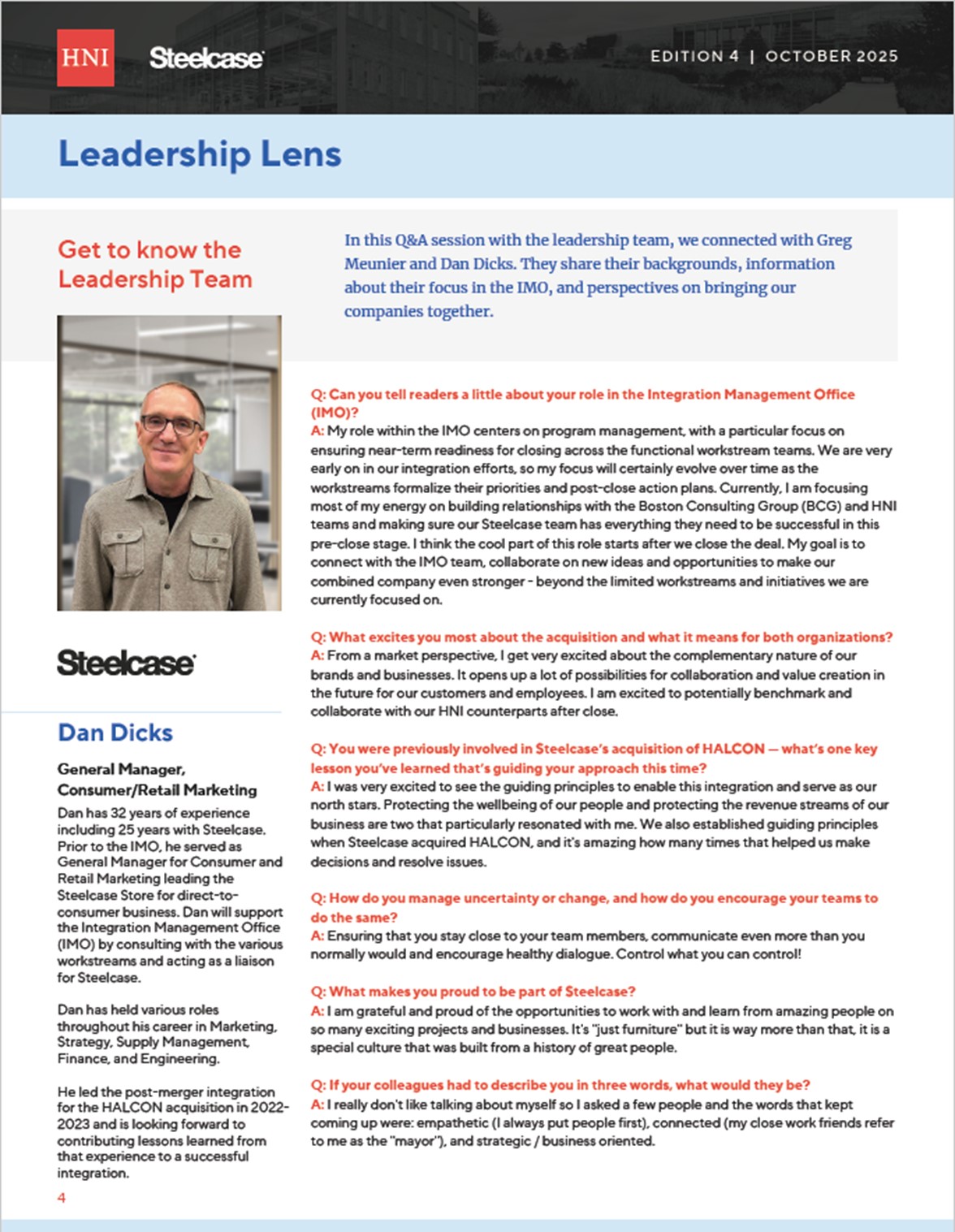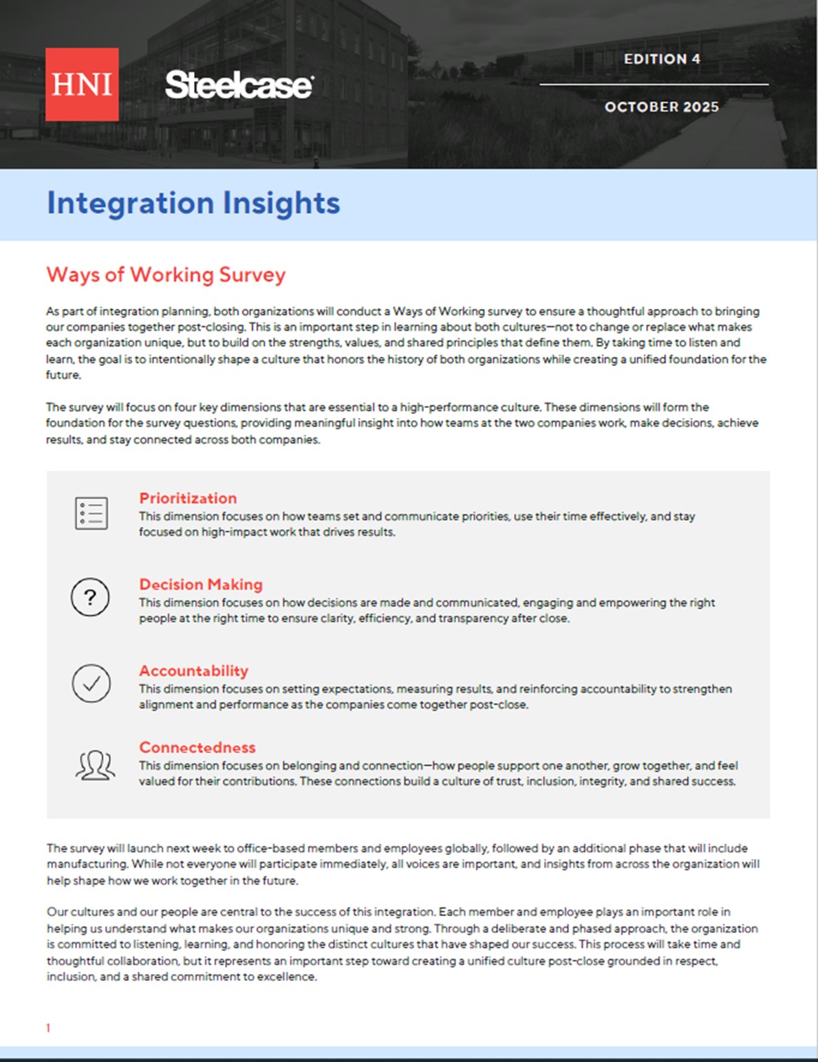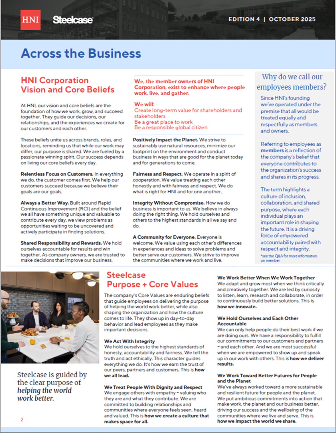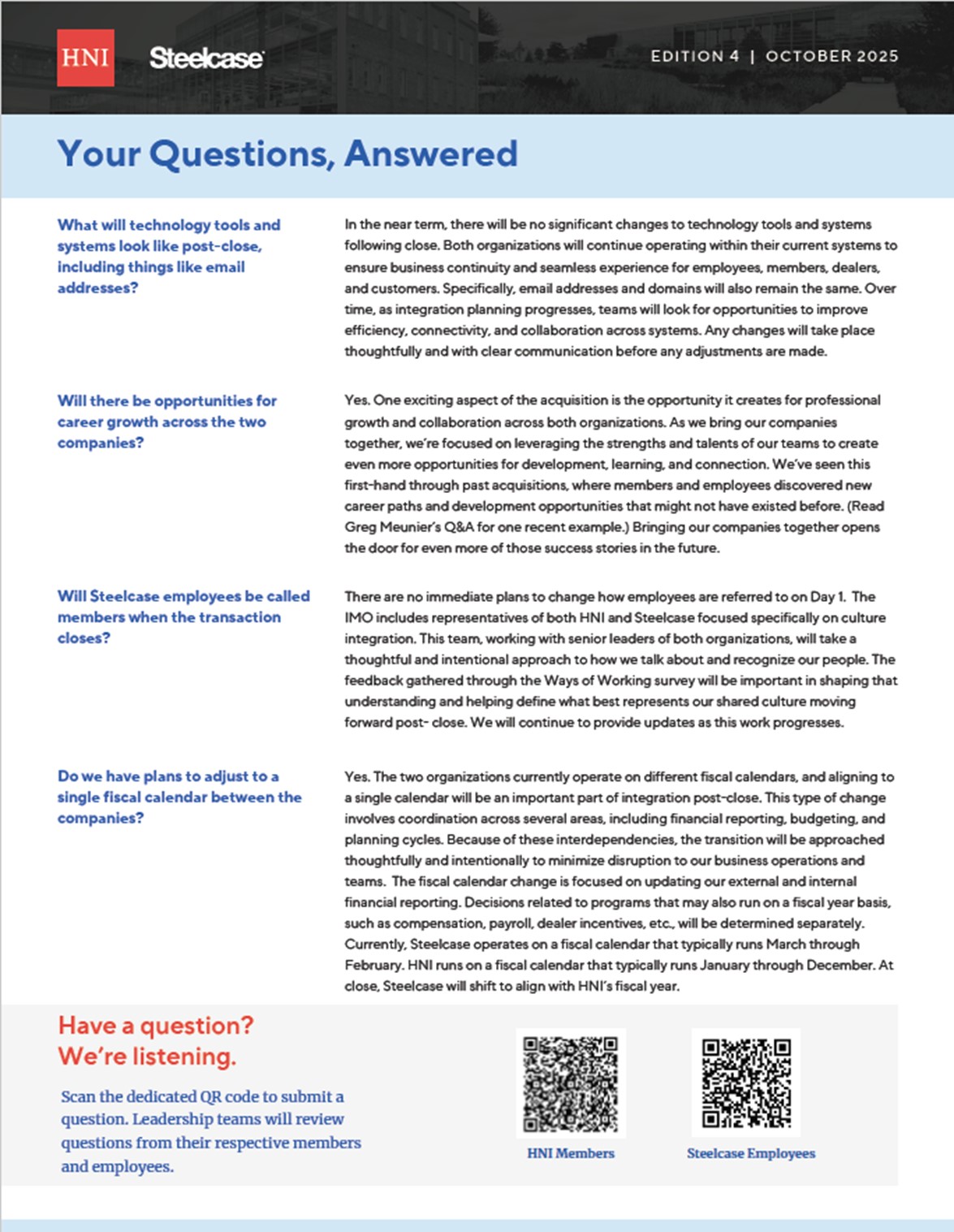 The following newsletter was sent to members of HNI Corporation and employees of Steelcase Inc. on October 22, 2025: