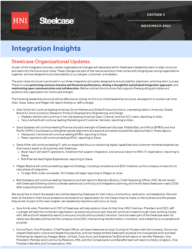 The following newsletter was sent to members of HNI Corporation and employees of Steelcase Inc. on November 12, 2025: