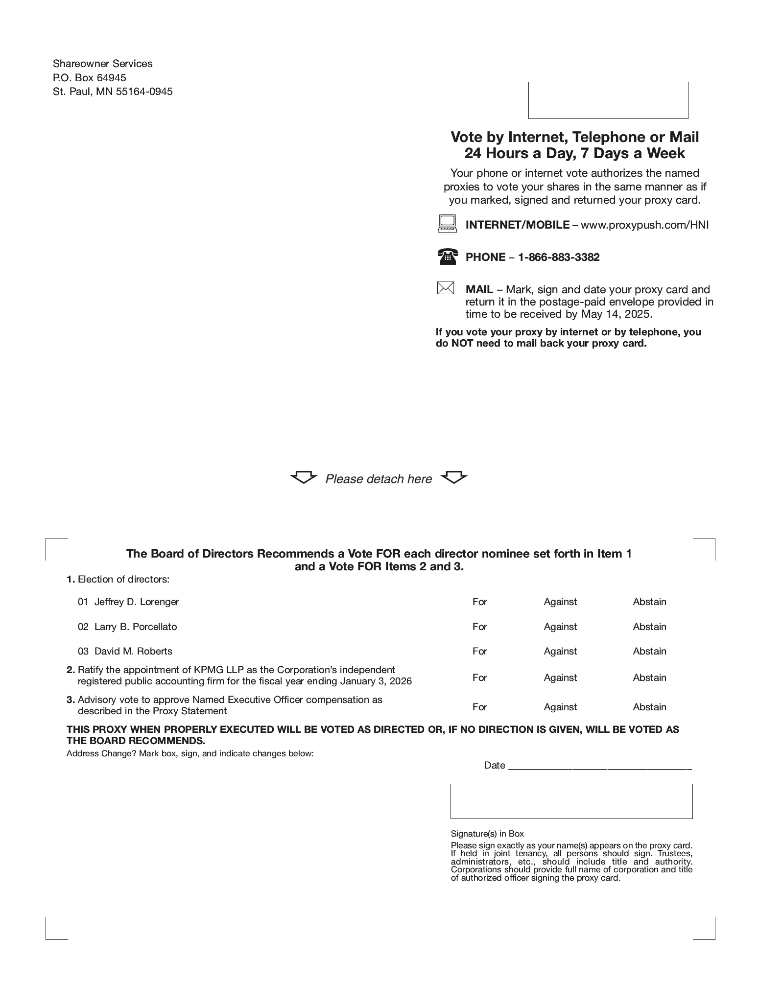 Shareholders and other interested parties who wish to communicate with the Board, or any director, should send an email to BoardofDirectors@hnicorp.com or mail a letter to the Board of Directors, c/o Corporate Secretary, HNI Corporation, 600 East Second Street, Muscatine, Iowa 52761, with a request to forward the communication to the intended recipient. Communications received will be reviewed by the office of the Corporate Secretary for the sole purpose of determining whether the contents are a message to the Board or any director and whether such message is appropriate. Communications not in the nature of advertising or promotions of a product or service, and not otherwise deemed inappropriate, will be promptly forwarded to the appropriate party.