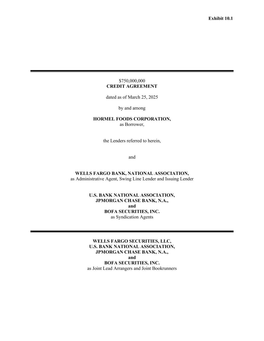 Exhibit 10.1 $750,000,000 CREDIT AGREEMENT dated as of March 25, 2025 by and among HORMEL FOODS CORPORATION, as Borrower, the Lenders referred to herein, and WELLS FARGO BANK, NATIONAL ASSOCIATION, as Administrative Agent, Swing Line Lender and Issuing Lender U.S. BANK NATIONAL ASSOCIATION, JPMORGAN CHASE BANK, N.A., and BOFA SECURITIES, INC. as Syndication Agents WELLS FARGO SECURITIES, LLC, U.S. BANK NATIONAL ASSOCIATION, JPMORGAN CHASE BANK, N.A., and BOFA SECURITIES, INC. as Joint Lead Arrangers and Joint Bookrunners