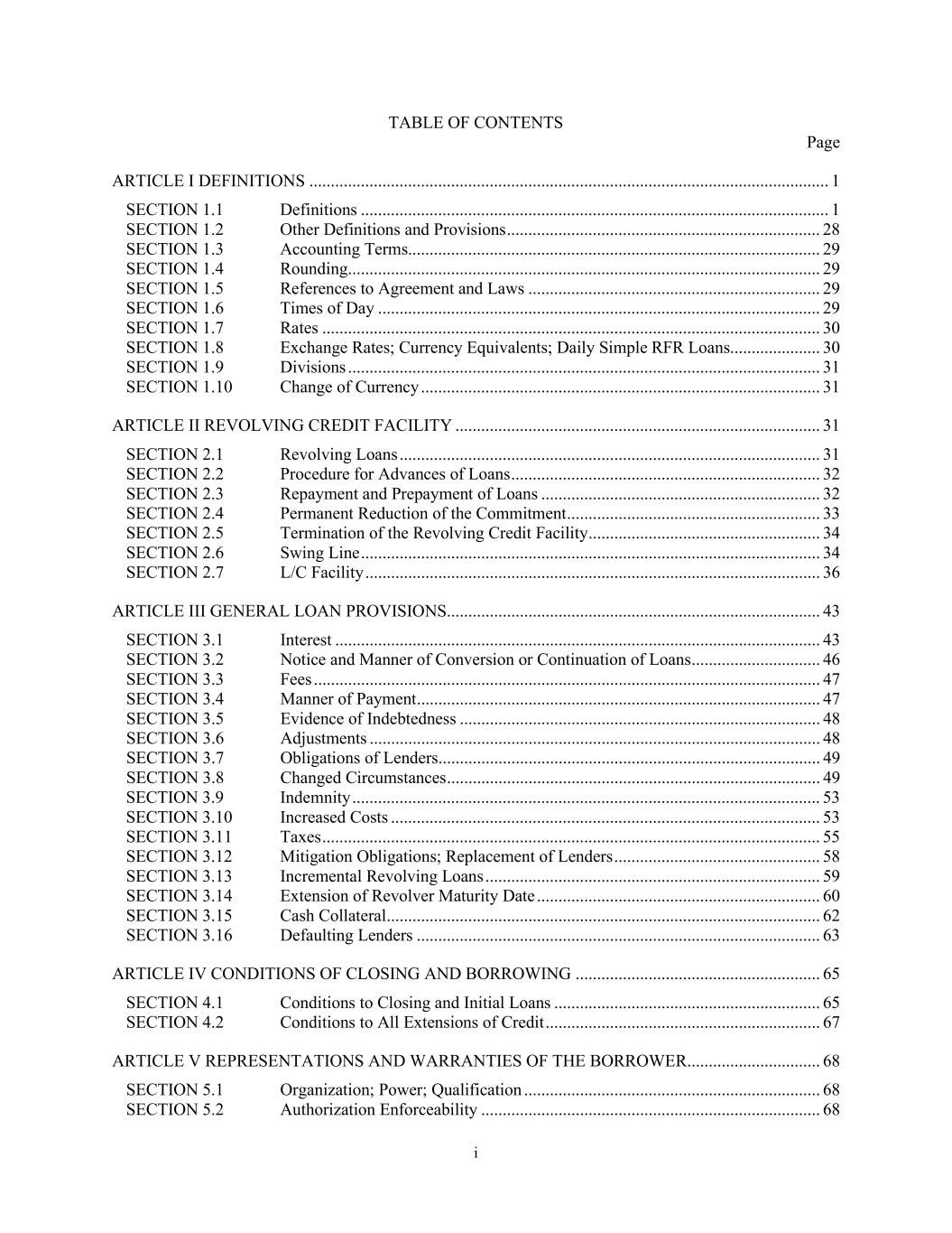 i TABLE OF CONTENTS Page ARTICLE I DEFINITIONS ......................................................................................................................... 1 SECTION 1.1 Definitions ............................................................................................................. 1 SECTION 1.2 Other Definitions and Provisions ......................................................................... 28 SECTION 1.3 Accounting Terms................................................................................................ 29 SECTION 1.4 Rounding .............................................................................................................. 29 SECTION 1.5 References to Agreement and Laws .................................................................... 29 SECTION 1.6 Times of Day ....................................................................................................... 29 SECTION 1.7 Rates .................................................................................................................... 30 SECTION 1.8 Exchange Rates; Currency Equivalents; Daily Simple RFR Loans..................... 30 SECTION 1.9 Divisions .............................................................................................................. 31 SECTION 1.10 Change of Currency ............................................................................................. 31 ARTICLE II REVOLVING CREDIT FACILITY ..................................................................................... 31 SECTION 2.1 Revolving Loans .................................................................................................. 31 SECTION 2.2 Procedure for Advances of Loans ........................................................................ 32 SECTION 2.3 Repayment and Prepayment of Loans ................................................................. 32 SECTION 2.4 Permanent Reduction of the Commitment ........................................................... 33 SECTION 2.5 Termination of the Revolving Credit Facility ...................................................... 34 SECTION 2.6 Swing Line ........................................................................................................... 34 SECTION 2.7 L/C Facility .......................................................................................................... 36 ARTICLE III GENERAL LOAN PROVISIONS....................................................................................... 43 SECTION 3.1 Interest ................................................................................................................. 43 SECTION 3.2 Notice and Manner of Conversion or Continuation of Loans .............................. 46 SECTION 3.3 Fees ...................................................................................................................... 47 SECTION 3.4 Manner of Payment .............................................................................................. 47 SECTION 3.5 Evidence of Indebtedness .................................................................................... 48 SECTION 3.6 Adjustments ......................................................................................................... 48 SECTION 3.7 Obligations of Lenders ......................................................................................... 49 SECTION 3.8 Changed Circumstances ....................................................................................... 49 SECTION 3.9 Indemnity ............................................................................................................. 53 SECTION 3.10 Increased Costs .................................................................................................... 53 SECTION 3.11 Taxes .................................................................................................................... 55 SECTION 3.12 Mitigation Obligations; Replacement of Lenders ................................................ 58 SECTION 3.13 Incremental Revolving Loans .............................................................................. 59 SECTION 3.14 Extension of Revolver Maturity Date .................................................................. 60 SECTION 3.15 Cash Collateral ..................................................................................................... 62 SECTION 3.16 Defaulting Lenders .............................................................................................. 63 ARTICLE IV CONDITIONS OF CLOSING AND BORROWING ......................................................... 65 SECTION 4.1 Conditions to Closing and Initial Loans .............................................................. 65 SECTION 4.2 Conditions to All Extensions of Credit ................................................................ 67 ARTICLE V REPRESENTATIONS AND WARRANTIES OF THE BORROWER ............................... 68 SECTION 5.1 Organization; Power; Qualification ..................................................................... 68 SECTION 5.2 Authorization Enforceability ............................................................................... 68
