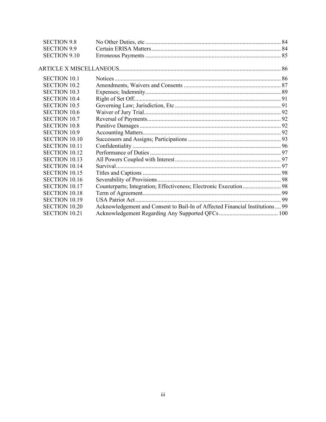 iii SECTION 9.8 No Other Duties, etc ............................................................................................ 84 SECTION 9.9 Certain ERISA Matters ........................................................................................ 84 SECTION 9.10 Erroneous Payments ............................................................................................ 85 ARTICLE X MISCELLANEOUS.............................................................................................................. 86 SECTION 10.1 Notices ................................................................................................................. 86 SECTION 10.2 Amendments, Waivers and Consents .................................................................. 87 SECTION 10.3 Expenses; Indemnity ............................................................................................ 89 SECTION 10.4 Right of Set Off.................................................................................................... 91 SECTION 10.5 Governing Law; Jurisdiction, Etc ........................................................................ 91 SECTION 10.6 Waiver of Jury Trial ............................................................................................. 92 SECTION 10.7 Reversal of Payments ........................................................................................... 92 SECTION 10.8 Punitive Damages ................................................................................................ 92 SECTION 10.9 Accounting Matters.............................................................................................. 92 SECTION 10.10 Successors and Assigns; Participations ............................................................... 93 SECTION 10.11 Confidentiality ..................................................................................................... 96 SECTION 10.12 Performance of Duties ......................................................................................... 97 SECTION 10.13 All Powers Coupled with Interest ........................................................................ 97 SECTION 10.14 Survival ................................................................................................................ 97 SECTION 10.15 Titles and Captions .............................................................................................. 98 SECTION 10.16 Severability of Provisions .................................................................................... 98 SECTION 10.17 Counterparts; Integration; Effectiveness; Electronic Execution .......................... 98 SECTION 10.18 Term of Agreement .............................................................................................. 99 SECTION 10.19 USA Patriot Act ................................................................................................... 99 SECTION 10.20 Acknowledgement and Consent to Bail-In of Affected Financial Institutions .... 99 SECTION 10.21 Acknowledgement Regarding Any Supported QFCs ........................................ 100