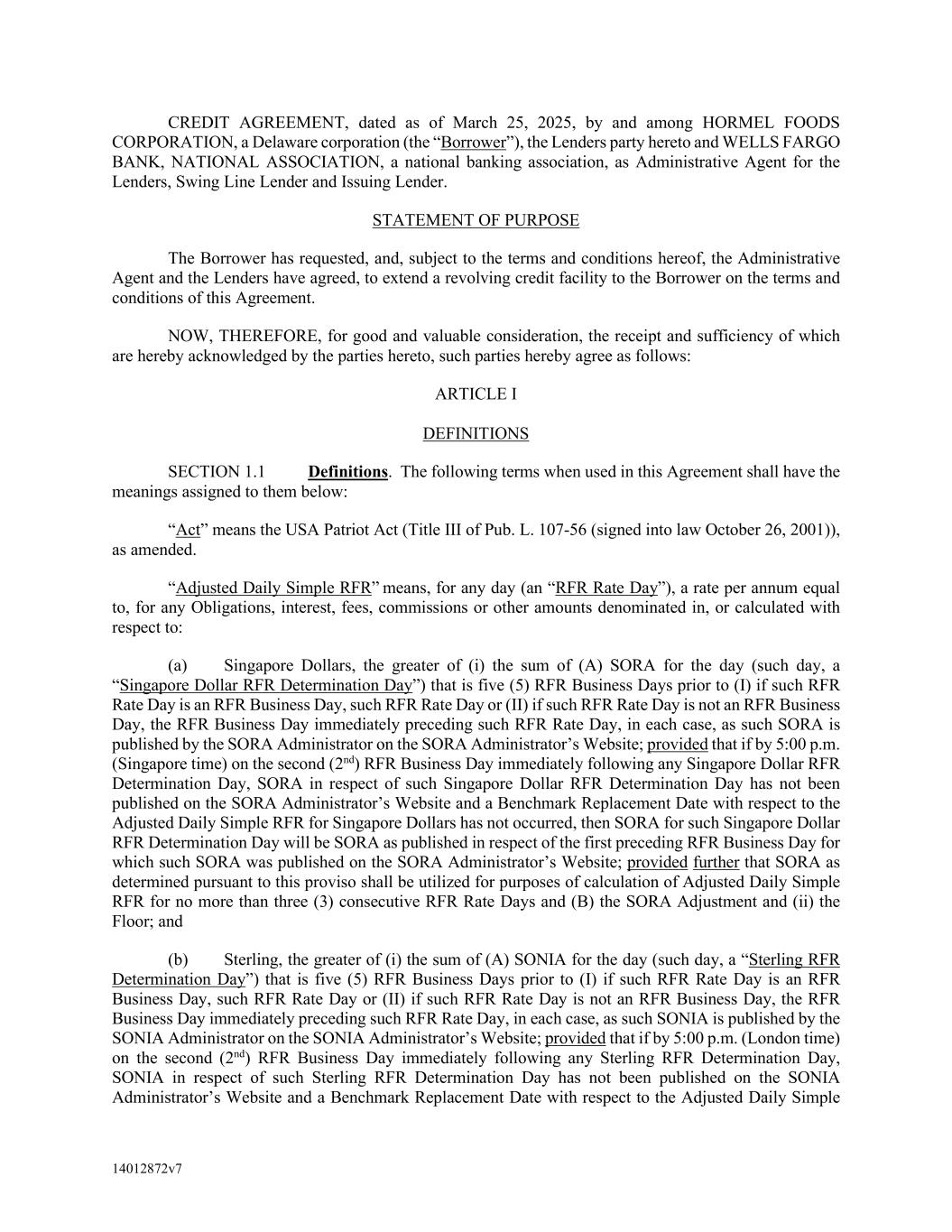 14012872v7 CREDIT AGREEMENT, dated as of March 25, 2025, by and among HORMEL FOODS CORPORATION, a Delaware corporation (the “Borrower”), the Lenders party hereto and WELLS FARGO BANK, NATIONAL ASSOCIATION, a national banking association, as Administrative Agent for the Lenders, Swing Line Lender and Issuing Lender. STATEMENT OF PURPOSE The Borrower has requested, and, subject to the terms and conditions hereof, the Administrative Agent and the Lenders have agreed, to extend a revolving credit facility to the Borrower on the terms and conditions of this Agreement. NOW, THEREFORE, for good and valuable consideration, the receipt and sufficiency of which are hereby acknowledged by the parties hereto, such parties hereby agree as follows: ARTICLE I DEFINITIONS SECTION 1.1 Definitions. The following terms when used in this Agreement shall have the meanings assigned to them below: “Act” means the USA Patriot Act (Title III of Pub. L. 107-56 (signed into law October 26, 2001)), as amended. “Adjusted Daily Simple RFR” means, for any day (an “RFR Rate Day”), a rate per annum equal to, for any Obligations, interest, fees, commissions or other amounts denominated in, or calculated with respect to: (a) Singapore Dollars, the greater of (i) the sum of (A) SORA for the day (such day, a “Singapore Dollar RFR Determination Day”) that is five (5) RFR Business Days prior to (I) if such RFR Rate Day is an RFR Business Day, such RFR Rate Day or (II) if such RFR Rate Day is not an RFR Business Day, the RFR Business Day immediately preceding such RFR Rate Day, in each case, as such SORA is published by the SORA Administrator on the SORA Administrator’s Website; provided that if by 5:00 p.m. (Singapore time) on the second (2nd) RFR Business Day immediately following any Singapore Dollar RFR Determination Day, SORA in respect of such Singapore Dollar RFR Determination Day has not been published on the SORA Administrator’s Website and a Benchmark Replacement Date with respect to the Adjusted Daily Simple RFR for Singapore Dollars has not occurred, then SORA for such Singapore Dollar RFR Determination Day will be SORA as published in respect of the first preceding RFR Business Day for which such SORA was published on the SORA Administrator’s Website; provided further that SORA as determined pursuant to this proviso shall be utilized for purposes of calculation of Adjusted Daily Simple RFR for no more than three (3) consecutive RFR Rate Days and (B) the SORA Adjustment and (ii) the Floor; and (b) Sterling, the greater of (i) the sum of (A) SONIA for the day (such day, a “Sterling RFR Determination Day”) that is five (5) RFR Business Days prior to (I) if such RFR Rate Day is an RFR Business Day, such RFR Rate Day or (II) if such RFR Rate Day is not an RFR Business Day, the RFR Business Day immediately preceding such RFR Rate Day, in each case, as such SONIA is published by the SONIA Administrator on the SONIA Administrator’s Website; provided that if by 5:00 p.m. (London time) on the second (2nd) RFR Business Day immediately following any Sterling RFR Determination Day, SONIA in respect of such Sterling RFR Determination Day has not been published on the SONIA Administrator’s Website and a Benchmark Replacement Date with respect to the Adjusted Daily Simple