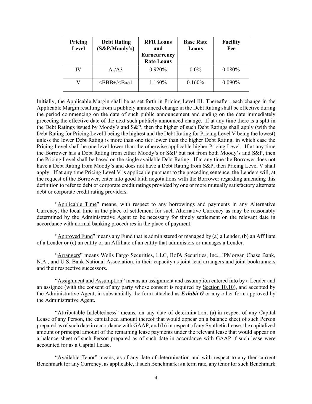 4 Pricing Level Debt Rating (S&P/Moody’s) RFR Loans and Eurocurrency Rate Loans Base Rate Loans Facility Fee IV A-/A3 0.920% 0.0% 0.080% V <BBB+/<Baa1 1.160% 0.160% 0.090% Initially, the Applicable Margin shall be as set forth in Pricing Level III. Thereafter, each change in the Applicable Margin resulting from a publicly announced change in the Debt Rating shall be effective during the period commencing on the date of such public announcement and ending on the date immediately preceding the effective date of the next such publicly announced change. If at any time there is a split in the Debt Ratings issued by Moody’s and S&P, then the higher of such Debt Ratings shall apply (with the Debt Rating for Pricing Level I being the highest and the Debt Rating for Pricing Level V being the lowest) unless the lower Debt Rating is more than one tier lower than the higher Debt Rating, in which case the Pricing Level shall be one level lower than the otherwise applicable higher Pricing Level. If at any time the Borrower has a Debt Rating from either Moody’s or S&P but not from both Moody’s and S&P, then the Pricing Level shall be based on the single available Debt Rating. If at any time the Borrower does not have a Debt Rating from Moody’s and does not have a Debt Rating from S&P, then Pricing Level V shall apply. If at any time Pricing Level V is applicable pursuant to the preceding sentence, the Lenders will, at the request of the Borrower, enter into good faith negotiations with the Borrower regarding amending this definition to refer to debt or corporate credit ratings provided by one or more mutually satisfactory alternate debt or corporate credit rating providers. “Applicable Time” means, with respect to any borrowings and payments in any Alternative Currency, the local time in the place of settlement for such Alternative Currency as may be reasonably determined by the Administrative Agent to be necessary for timely settlement on the relevant date in accordance with normal banking procedures in the place of payment. “Approved Fund” means any Fund that is administered or managed by (a) a Lender, (b) an Affiliate of a Lender or (c) an entity or an Affiliate of an entity that administers or manages a Lender. “Arrangers” means Wells Fargo Securities, LLC, BofA Securities, Inc., JPMorgan Chase Bank, N.A., and U.S. Bank National Association, in their capacity as joint lead arrangers and joint bookrunners and their respective successors. “Assignment and Assumption” means an assignment and assumption entered into by a Lender and an assignee (with the consent of any party whose consent is required by Section 10.10), and accepted by the Administrative Agent, in substantially the form attached as Exhibit G or any other form approved by the Administrative Agent. “Attributable Indebtedness” means, on any date of determination, (a) in respect of any Capital Lease of any Person, the capitalized amount thereof that would appear on a balance sheet of such Person prepared as of such date in accordance with GAAP, and (b) in respect of any Synthetic Lease, the capitalized amount or principal amount of the remaining lease payments under the relevant lease that would appear on a balance sheet of such Person prepared as of such date in accordance with GAAP if such lease were accounted for as a Capital Lease. “Available Tenor” means, as of any date of determination and with respect to any then-current Benchmark for any Currency, as applicable, if such Benchmark is a term rate, any tenor for such Benchmark