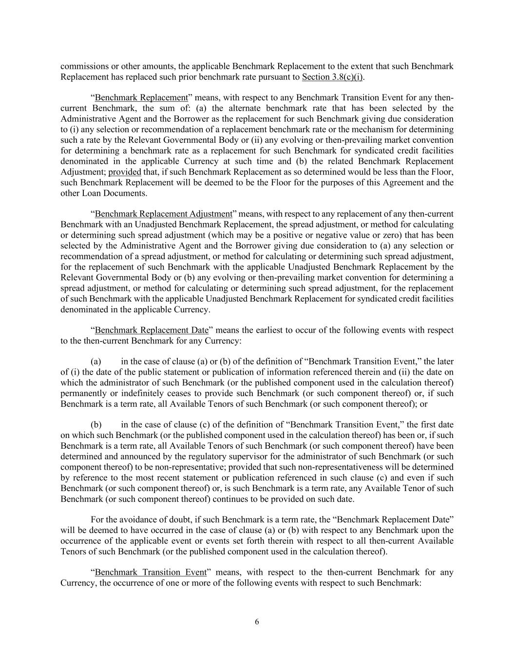 6 commissions or other amounts, the applicable Benchmark Replacement to the extent that such Benchmark Replacement has replaced such prior benchmark rate pursuant to Section 3.8(c)(i). “Benchmark Replacement” means, with respect to any Benchmark Transition Event for any then- current Benchmark, the sum of: (a) the alternate benchmark rate that has been selected by the Administrative Agent and the Borrower as the replacement for such Benchmark giving due consideration to (i) any selection or recommendation of a replacement benchmark rate or the mechanism for determining such a rate by the Relevant Governmental Body or (ii) any evolving or then-prevailing market convention for determining a benchmark rate as a replacement for such Benchmark for syndicated credit facilities denominated in the applicable Currency at such time and (b) the related Benchmark Replacement Adjustment; provided that, if such Benchmark Replacement as so determined would be less than the Floor, such Benchmark Replacement will be deemed to be the Floor for the purposes of this Agreement and the other Loan Documents. “Benchmark Replacement Adjustment” means, with respect to any replacement of any then-current Benchmark with an Unadjusted Benchmark Replacement, the spread adjustment, or method for calculating or determining such spread adjustment (which may be a positive or negative value or zero) that has been selected by the Administrative Agent and the Borrower giving due consideration to (a) any selection or recommendation of a spread adjustment, or method for calculating or determining such spread adjustment, for the replacement of such Benchmark with the applicable Unadjusted Benchmark Replacement by the Relevant Governmental Body or (b) any evolving or then-prevailing market convention for determining a spread adjustment, or method for calculating or determining such spread adjustment, for the replacement of such Benchmark with the applicable Unadjusted Benchmark Replacement for syndicated credit facilities denominated in the applicable Currency. “Benchmark Replacement Date” means the earliest to occur of the following events with respect to the then-current Benchmark for any Currency: (a) in the case of clause (a) or (b) of the definition of “Benchmark Transition Event,” the later of (i) the date of the public statement or publication of information referenced therein and (ii) the date on which the administrator of such Benchmark (or the published component used in the calculation thereof) permanently or indefinitely ceases to provide such Benchmark (or such component thereof) or, if such Benchmark is a term rate, all Available Tenors of such Benchmark (or such component thereof); or (b) in the case of clause (c) of the definition of “Benchmark Transition Event,” the first date on which such Benchmark (or the published component used in the calculation thereof) has been or, if such Benchmark is a term rate, all Available Tenors of such Benchmark (or such component thereof) have been determined and announced by the regulatory supervisor for the administrator of such Benchmark (or such component thereof) to be non-representative; provided that such non-representativeness will be determined by reference to the most recent statement or publication referenced in such clause (c) and even if such Benchmark (or such component thereof) or, is such Benchmark is a term rate, any Available Tenor of such Benchmark (or such component thereof) continues to be provided on such date. For the avoidance of doubt, if such Benchmark is a term rate, the “Benchmark Replacement Date” will be deemed to have occurred in the case of clause (a) or (b) with respect to any Benchmark upon the occurrence of the applicable event or events set forth therein with respect to all then-current Available Tenors of such Benchmark (or the published component used in the calculation thereof). “Benchmark Transition Event” means, with respect to the then-current Benchmark for any Currency, the occurrence of one or more of the following events with respect to such Benchmark: