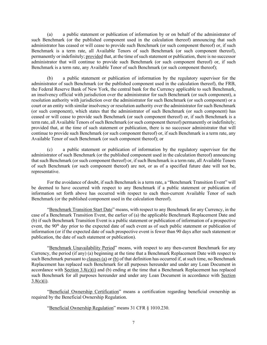7 (a) a public statement or publication of information by or on behalf of the administrator of such Benchmark (or the published component used in the calculation thereof) announcing that such administrator has ceased or will cease to provide such Benchmark (or such component thereof) or, if such Benchmark is a term rate, all Available Tenors of such Benchmark (or such component thereof), permanently or indefinitely; provided that, at the time of such statement or publication, there is no successor administrator that will continue to provide such Benchmark (or such component thereof) or, if such Benchmark is a term rate, any Available Tenor of such Benchmark (or such component thereof); (b) a public statement or publication of information by the regulatory supervisor for the administrator of such Benchmark (or the published component used in the calculation thereof), the FRB, the Federal Reserve Bank of New York, the central bank for the Currency applicable to such Benchmark, an insolvency official with jurisdiction over the administrator for such Benchmark (or such component), a resolution authority with jurisdiction over the administrator for such Benchmark (or such component) or a court or an entity with similar insolvency or resolution authority over the administrator for such Benchmark (or such component), which states that the administrator of such Benchmark (or such component) has ceased or will cease to provide such Benchmark (or such component thereof) or, if such Benchmark is a term rate, all Available Tenors of such Benchmark (or such component thereof) permanently or indefinitely; provided that, at the time of such statement or publication, there is no successor administrator that will continue to provide such Benchmark (or such component thereof) or, if such Benchmark is a term rate, any Available Tenor of such Benchmark (or such component thereof); or (c) a public statement or publication of information by the regulatory supervisor for the administrator of such Benchmark (or the published component used in the calculation thereof) announcing that such Benchmark (or such component thereof) or, if such Benchmark is a term rate, all Available Tenors of such Benchmark (or such component thereof) are not, or as of a specified future date will not be, representative. For the avoidance of doubt, if such Benchmark is a term rate, a “Benchmark Transition Event” will be deemed to have occurred with respect to any Benchmark if a public statement or publication of information set forth above has occurred with respect to each then-current Available Tenor of such Benchmark (or the published component used in the calculation thereof). “Benchmark Transition Start Date” means, with respect to any Benchmark for any Currency, in the case of a Benchmark Transition Event, the earlier of (a) the applicable Benchmark Replacement Date and (b) if such Benchmark Transition Event is a public statement or publication of information of a prospective event, the 90th day prior to the expected date of such event as of such public statement or publication of information (or if the expected date of such prospective event is fewer than 90 days after such statement or publication, the date of such statement or publication). “Benchmark Unavailability Period” means, with respect to any then-current Benchmark for any Currency, the period (if any) (a) beginning at the time that a Benchmark Replacement Date with respect to such Benchmark pursuant to clauses (a) or (b) of that definition has occurred if, at such time, no Benchmark Replacement has replaced such Benchmark for all purposes hereunder and under any Loan Document in accordance with Section 3.8(c)(i) and (b) ending at the time that a Benchmark Replacement has replaced such Benchmark for all purposes hereunder and under any Loan Document in accordance with Section 3.8(c)(i). “Beneficial Ownership Certification” means a certification regarding beneficial ownership as required by the Beneficial Ownership Regulation. “Beneficial Ownership Regulation” means 31 CFR § 1010.230.