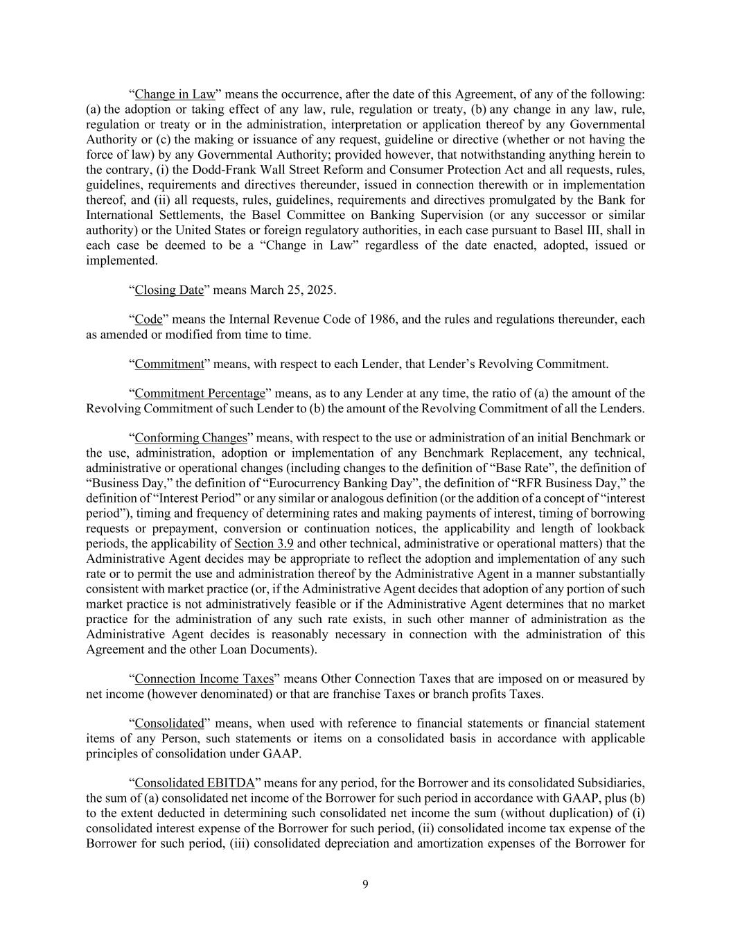 9 “Change in Law” means the occurrence, after the date of this Agreement, of any of the following: (a) the adoption or taking effect of any law, rule, regulation or treaty, (b) any change in any law, rule, regulation or treaty or in the administration, interpretation or application thereof by any Governmental Authority or (c) the making or issuance of any request, guideline or directive (whether or not having the force of law) by any Governmental Authority; provided however, that notwithstanding anything herein to the contrary, (i) the Dodd-Frank Wall Street Reform and Consumer Protection Act and all requests, rules, guidelines, requirements and directives thereunder, issued in connection therewith or in implementation thereof, and (ii) all requests, rules, guidelines, requirements and directives promulgated by the Bank for International Settlements, the Basel Committee on Banking Supervision (or any successor or similar authority) or the United States or foreign regulatory authorities, in each case pursuant to Basel III, shall in each case be deemed to be a “Change in Law” regardless of the date enacted, adopted, issued or implemented. “Closing Date” means March 25, 2025. “Code” means the Internal Revenue Code of 1986, and the rules and regulations thereunder, each as amended or modified from time to time. “Commitment” means, with respect to each Lender, that Lender’s Revolving Commitment. “Commitment Percentage” means, as to any Lender at any time, the ratio of (a) the amount of the Revolving Commitment of such Lender to (b) the amount of the Revolving Commitment of all the Lenders. “Conforming Changes” means, with respect to the use or administration of an initial Benchmark or the use, administration, adoption or implementation of any Benchmark Replacement, any technical, administrative or operational changes (including changes to the definition of “Base Rate”, the definition of “Business Day,” the definition of “Eurocurrency Banking Day”, the definition of “RFR Business Day,” the definition of “Interest Period” or any similar or analogous definition (or the addition of a concept of “interest period”), timing and frequency of determining rates and making payments of interest, timing of borrowing requests or prepayment, conversion or continuation notices, the applicability and length of lookback periods, the applicability of Section 3.9 and other technical, administrative or operational matters) that the Administrative Agent decides may be appropriate to reflect the adoption and implementation of any such rate or to permit the use and administration thereof by the Administrative Agent in a manner substantially consistent with market practice (or, if the Administrative Agent decides that adoption of any portion of such market practice is not administratively feasible or if the Administrative Agent determines that no market practice for the administration of any such rate exists, in such other manner of administration as the Administrative Agent decides is reasonably necessary in connection with the administration of this Agreement and the other Loan Documents). “Connection Income Taxes” means Other Connection Taxes that are imposed on or measured by net income (however denominated) or that are franchise Taxes or branch profits Taxes. “Consolidated” means, when used with reference to financial statements or financial statement items of any Person, such statements or items on a consolidated basis in accordance with applicable principles of consolidation under GAAP. “Consolidated EBITDA” means for any period, for the Borrower and its consolidated Subsidiaries, the sum of (a) consolidated net income of the Borrower for such period in accordance with GAAP, plus (b) to the extent deducted in determining such consolidated net income the sum (without duplication) of (i) consolidated interest expense of the Borrower for such period, (ii) consolidated income tax expense of the Borrower for such period, (iii) consolidated depreciation and amortization expenses of the Borrower for