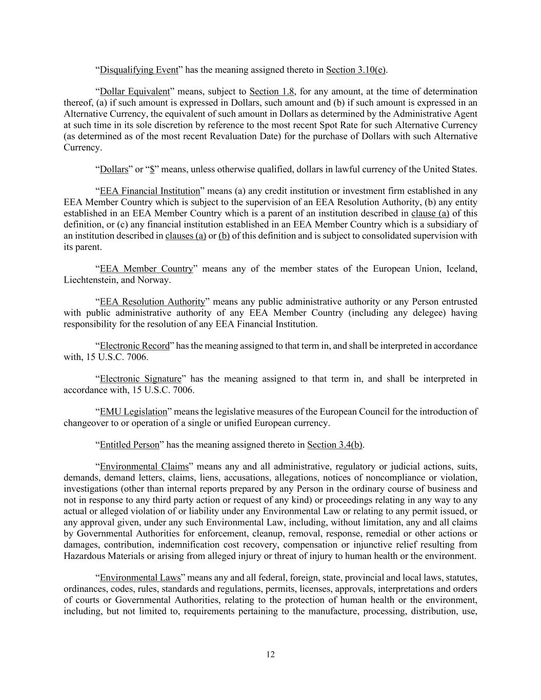 12 “Disqualifying Event” has the meaning assigned thereto in Section 3.10(e). “Dollar Equivalent” means, subject to Section 1.8, for any amount, at the time of determination thereof, (a) if such amount is expressed in Dollars, such amount and (b) if such amount is expressed in an Alternative Currency, the equivalent of such amount in Dollars as determined by the Administrative Agent at such time in its sole discretion by reference to the most recent Spot Rate for such Alternative Currency (as determined as of the most recent Revaluation Date) for the purchase of Dollars with such Alternative Currency. “Dollars” or “$” means, unless otherwise qualified, dollars in lawful currency of the United States. “EEA Financial Institution” means (a) any credit institution or investment firm established in any EEA Member Country which is subject to the supervision of an EEA Resolution Authority, (b) any entity established in an EEA Member Country which is a parent of an institution described in clause (a) of this definition, or (c) any financial institution established in an EEA Member Country which is a subsidiary of an institution described in clauses (a) or (b) of this definition and is subject to consolidated supervision with its parent. “EEA Member Country” means any of the member states of the European Union, Iceland, Liechtenstein, and Norway. “EEA Resolution Authority” means any public administrative authority or any Person entrusted with public administrative authority of any EEA Member Country (including any delegee) having responsibility for the resolution of any EEA Financial Institution. “Electronic Record” has the meaning assigned to that term in, and shall be interpreted in accordance with, 15 U.S.C. 7006. “Electronic Signature” has the meaning assigned to that term in, and shall be interpreted in accordance with, 15 U.S.C. 7006. “EMU Legislation” means the legislative measures of the European Council for the introduction of changeover to or operation of a single or unified European currency. “Entitled Person” has the meaning assigned thereto in Section 3.4(b). “Environmental Claims” means any and all administrative, regulatory or judicial actions, suits, demands, demand letters, claims, liens, accusations, allegations, notices of noncompliance or violation, investigations (other than internal reports prepared by any Person in the ordinary course of business and not in response to any third party action or request of any kind) or proceedings relating in any way to any actual or alleged violation of or liability under any Environmental Law or relating to any permit issued, or any approval given, under any such Environmental Law, including, without limitation, any and all claims by Governmental Authorities for enforcement, cleanup, removal, response, remedial or other actions or damages, contribution, indemnification cost recovery, compensation or injunctive relief resulting from Hazardous Materials or arising from alleged injury or threat of injury to human health or the environment. “Environmental Laws” means any and all federal, foreign, state, provincial and local laws, statutes, ordinances, codes, rules, standards and regulations, permits, licenses, approvals, interpretations and orders of courts or Governmental Authorities, relating to the protection of human health or the environment, including, but not limited to, requirements pertaining to the manufacture, processing, distribution, use,