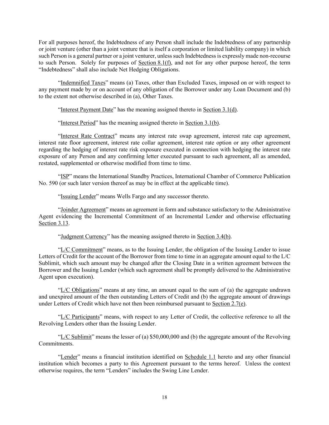 18 For all purposes hereof, the Indebtedness of any Person shall include the Indebtedness of any partnership or joint venture (other than a joint venture that is itself a corporation or limited liability company) in which such Person is a general partner or a joint venturer, unless such Indebtedness is expressly made non-recourse to such Person. Solely for purposes of Section 8.1(f), and not for any other purpose hereof, the term “Indebtedness” shall also include Net Hedging Obligations. “Indemnified Taxes” means (a) Taxes, other than Excluded Taxes, imposed on or with respect to any payment made by or on account of any obligation of the Borrower under any Loan Document and (b) to the extent not otherwise described in (a), Other Taxes. “Interest Payment Date” has the meaning assigned thereto in Section 3.1(d). “Interest Period” has the meaning assigned thereto in Section 3.1(b). “Interest Rate Contract” means any interest rate swap agreement, interest rate cap agreement, interest rate floor agreement, interest rate collar agreement, interest rate option or any other agreement regarding the hedging of interest rate risk exposure executed in connection with hedging the interest rate exposure of any Person and any confirming letter executed pursuant to such agreement, all as amended, restated, supplemented or otherwise modified from time to time. “ISP” means the International Standby Practices, International Chamber of Commerce Publication No. 590 (or such later version thereof as may be in effect at the applicable time). “Issuing Lender” means Wells Fargo and any successor thereto. “Joinder Agreement” means an agreement in form and substance satisfactory to the Administrative Agent evidencing the Incremental Commitment of an Incremental Lender and otherwise effectuating Section 3.13. “Judgment Currency” has the meaning assigned thereto in Section 3.4(b). “L/C Commitment” means, as to the Issuing Lender, the obligation of the Issuing Lender to issue Letters of Credit for the account of the Borrower from time to time in an aggregate amount equal to the L/C Sublimit, which such amount may be changed after the Closing Date in a written agreement between the Borrower and the Issuing Lender (which such agreement shall be promptly delivered to the Administrative Agent upon execution). “L/C Obligations” means at any time, an amount equal to the sum of (a) the aggregate undrawn and unexpired amount of the then outstanding Letters of Credit and (b) the aggregate amount of drawings under Letters of Credit which have not then been reimbursed pursuant to Section 2.7(e). “L/C Participants” means, with respect to any Letter of Credit, the collective reference to all the Revolving Lenders other than the Issuing Lender. “L/C Sublimit” means the lesser of (a) $50,000,000 and (b) the aggregate amount of the Revolving Commitments. “Lender” means a financial institution identified on Schedule 1.1 hereto and any other financial institution which becomes a party to this Agreement pursuant to the terms hereof. Unless the context otherwise requires, the term “Lenders” includes the Swing Line Lender.