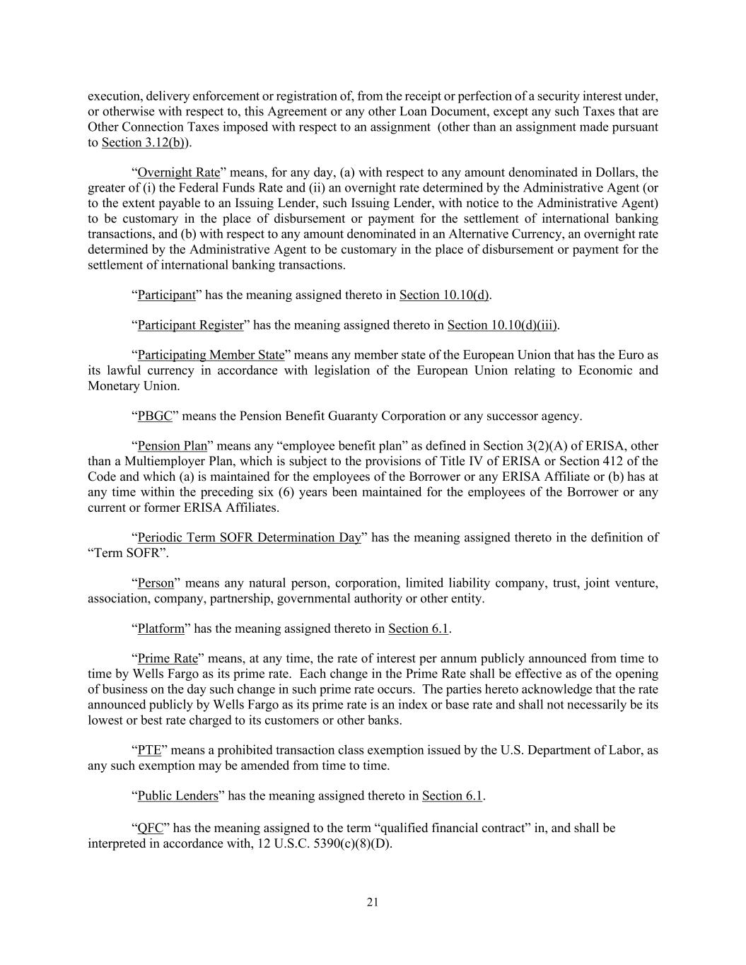 21 execution, delivery enforcement or registration of, from the receipt or perfection of a security interest under, or otherwise with respect to, this Agreement or any other Loan Document, except any such Taxes that are Other Connection Taxes imposed with respect to an assignment (other than an assignment made pursuant to Section 3.12(b)). “Overnight Rate” means, for any day, (a) with respect to any amount denominated in Dollars, the greater of (i) the Federal Funds Rate and (ii) an overnight rate determined by the Administrative Agent (or to the extent payable to an Issuing Lender, such Issuing Lender, with notice to the Administrative Agent) to be customary in the place of disbursement or payment for the settlement of international banking transactions, and (b) with respect to any amount denominated in an Alternative Currency, an overnight rate determined by the Administrative Agent to be customary in the place of disbursement or payment for the settlement of international banking transactions. “Participant” has the meaning assigned thereto in Section 10.10(d). “Participant Register” has the meaning assigned thereto in Section 10.10(d)(iii). “Participating Member State” means any member state of the European Union that has the Euro as its lawful currency in accordance with legislation of the European Union relating to Economic and Monetary Union. “PBGC” means the Pension Benefit Guaranty Corporation or any successor agency. “Pension Plan” means any “employee benefit plan” as defined in Section 3(2)(A) of ERISA, other than a Multiemployer Plan, which is subject to the provisions of Title IV of ERISA or Section 412 of the Code and which (a) is maintained for the employees of the Borrower or any ERISA Affiliate or (b) has at any time within the preceding six (6) years been maintained for the employees of the Borrower or any current or former ERISA Affiliates. “Periodic Term SOFR Determination Day” has the meaning assigned thereto in the definition of “Term SOFR”. “Person” means any natural person, corporation, limited liability company, trust, joint venture, association, company, partnership, governmental authority or other entity. “Platform” has the meaning assigned thereto in Section 6.1. “Prime Rate” means, at any time, the rate of interest per annum publicly announced from time to time by Wells Fargo as its prime rate. Each change in the Prime Rate shall be effective as of the opening of business on the day such change in such prime rate occurs. The parties hereto acknowledge that the rate announced publicly by Wells Fargo as its prime rate is an index or base rate and shall not necessarily be its lowest or best rate charged to its customers or other banks. “PTE” means a prohibited transaction class exemption issued by the U.S. Department of Labor, as any such exemption may be amended from time to time. “Public Lenders” has the meaning assigned thereto in Section 6.1. “QFC” has the meaning assigned to the term “qualified financial contract” in, and shall be interpreted in accordance with, 12 U.S.C. 5390(c)(8)(D).