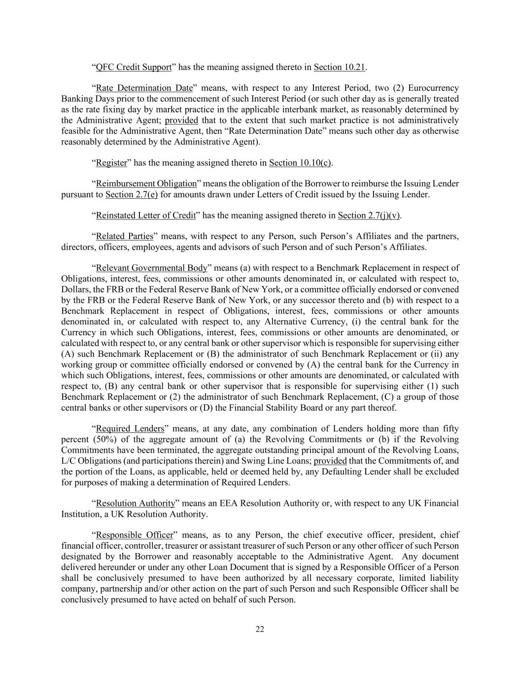 22 “QFC Credit Support” has the meaning assigned thereto in Section 10.21. “Rate Determination Date” means, with respect to any Interest Period, two (2) Eurocurrency Banking Days prior to the commencement of such Interest Period (or such other day as is generally treated as the rate fixing day by market practice in the applicable interbank market, as reasonably determined by the Administrative Agent; provided that to the extent that such market practice is not administratively feasible for the Administrative Agent, then “Rate Determination Date” means such other day as otherwise reasonably determined by the Administrative Agent). “Register” has the meaning assigned thereto in Section 10.10(c). “Reimbursement Obligation” means the obligation of the Borrower to reimburse the Issuing Lender pursuant to Section 2.7(e) for amounts drawn under Letters of Credit issued by the Issuing Lender. “Reinstated Letter of Credit” has the meaning assigned thereto in Section 2.7(j)(v). “Related Parties” means, with respect to any Person, such Person’s Affiliates and the partners, directors, officers, employees, agents and advisors of such Person and of such Person’s Affiliates. “Relevant Governmental Body” means (a) with respect to a Benchmark Replacement in respect of Obligations, interest, fees, commissions or other amounts denominated in, or calculated with respect to, Dollars, the FRB or the Federal Reserve Bank of New York, or a committee officially endorsed or convened by the FRB or the Federal Reserve Bank of New York, or any successor thereto and (b) with respect to a Benchmark Replacement in respect of Obligations, interest, fees, commissions or other amounts denominated in, or calculated with respect to, any Alternative Currency, (i) the central bank for the Currency in which such Obligations, interest, fees, commissions or other amounts are denominated, or calculated with respect to, or any central bank or other supervisor which is responsible for supervising either (A) such Benchmark Replacement or (B) the administrator of such Benchmark Replacement or (ii) any working group or committee officially endorsed or convened by (A) the central bank for the Currency in which such Obligations, interest, fees, commissions or other amounts are denominated, or calculated with respect to, (B) any central bank or other supervisor that is responsible for supervising either (1) such Benchmark Replacement or (2) the administrator of such Benchmark Replacement, (C) a group of those central banks or other supervisors or (D) the Financial Stability Board or any part thereof. “Required Lenders” means, at any date, any combination of Lenders holding more than fifty percent (50%) of the aggregate amount of (a) the Revolving Commitments or (b) if the Revolving Commitments have been terminated, the aggregate outstanding principal amount of the Revolving Loans, L/C Obligations (and participations therein) and Swing Line Loans; provided that the Commitments of, and the portion of the Loans, as applicable, held or deemed held by, any Defaulting Lender shall be excluded for purposes of making a determination of Required Lenders. “Resolution Authority” means an EEA Resolution Authority or, with respect to any UK Financial Institution, a UK Resolution Authority. “Responsible Officer” means, as to any Person, the chief executive officer, president, chief financial officer, controller, treasurer or assistant treasurer of such Person or any other officer of such Person designated by the Borrower and reasonably acceptable to the Administrative Agent. Any document delivered hereunder or under any other Loan Document that is signed by a Responsible Officer of a Person shall be conclusively presumed to have been authorized by all necessary corporate, limited liability company, partnership and/or other action on the part of such Person and such Responsible Officer shall be conclusively presumed to have acted on behalf of such Person.