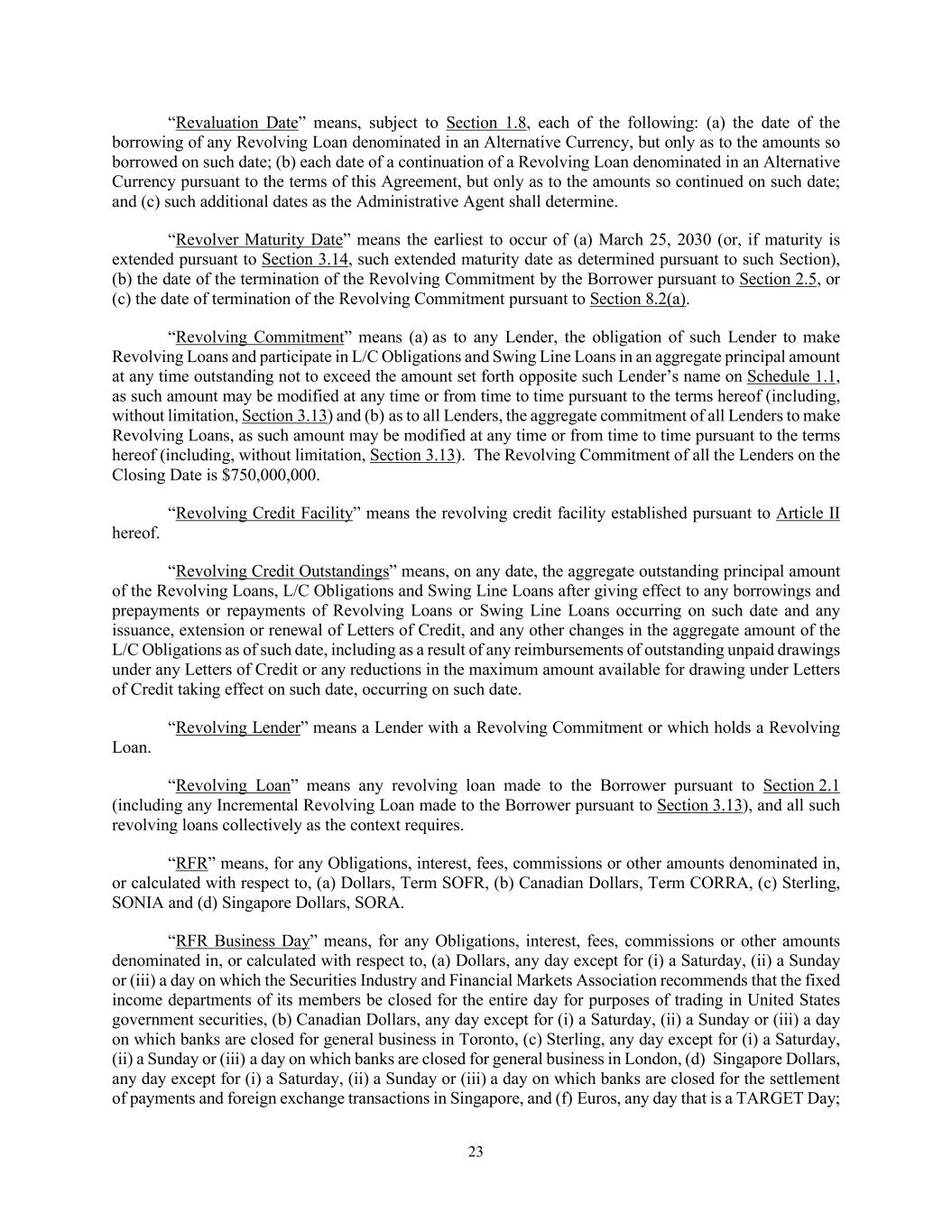 23 “Revaluation Date” means, subject to Section 1.8, each of the following: (a) the date of the borrowing of any Revolving Loan denominated in an Alternative Currency, but only as to the amounts so borrowed on such date; (b) each date of a continuation of a Revolving Loan denominated in an Alternative Currency pursuant to the terms of this Agreement, but only as to the amounts so continued on such date; and (c) such additional dates as the Administrative Agent shall determine. “Revolver Maturity Date” means the earliest to occur of (a) March 25, 2030 (or, if maturity is extended pursuant to Section 3.14, such extended maturity date as determined pursuant to such Section), (b) the date of the termination of the Revolving Commitment by the Borrower pursuant to Section 2.5, or (c) the date of termination of the Revolving Commitment pursuant to Section 8.2(a). “Revolving Commitment” means (a) as to any Lender, the obligation of such Lender to make Revolving Loans and participate in L/C Obligations and Swing Line Loans in an aggregate principal amount at any time outstanding not to exceed the amount set forth opposite such Lender’s name on Schedule 1.1, as such amount may be modified at any time or from time to time pursuant to the terms hereof (including, without limitation, Section 3.13) and (b) as to all Lenders, the aggregate commitment of all Lenders to make Revolving Loans, as such amount may be modified at any time or from time to time pursuant to the terms hereof (including, without limitation, Section 3.13). The Revolving Commitment of all the Lenders on the Closing Date is $750,000,000. “Revolving Credit Facility” means the revolving credit facility established pursuant to Article II hereof. “Revolving Credit Outstandings” means, on any date, the aggregate outstanding principal amount of the Revolving Loans, L/C Obligations and Swing Line Loans after giving effect to any borrowings and prepayments or repayments of Revolving Loans or Swing Line Loans occurring on such date and any issuance, extension or renewal of Letters of Credit, and any other changes in the aggregate amount of the L/C Obligations as of such date, including as a result of any reimbursements of outstanding unpaid drawings under any Letters of Credit or any reductions in the maximum amount available for drawing under Letters of Credit taking effect on such date, occurring on such date. “Revolving Lender” means a Lender with a Revolving Commitment or which holds a Revolving Loan. “Revolving Loan” means any revolving loan made to the Borrower pursuant to Section 2.1 (including any Incremental Revolving Loan made to the Borrower pursuant to Section 3.13), and all such revolving loans collectively as the context requires. “RFR” means, for any Obligations, interest, fees, commissions or other amounts denominated in, or calculated with respect to, (a) Dollars, Term SOFR, (b) Canadian Dollars, Term CORRA, (c) Sterling, SONIA and (d) Singapore Dollars, SORA. “RFR Business Day” means, for any Obligations, interest, fees, commissions or other amounts denominated in, or calculated with respect to, (a) Dollars, any day except for (i) a Saturday, (ii) a Sunday or (iii) a day on which the Securities Industry and Financial Markets Association recommends that the fixed income departments of its members be closed for the entire day for purposes of trading in United States government securities, (b) Canadian Dollars, any day except for (i) a Saturday, (ii) a Sunday or (iii) a day on which banks are closed for general business in Toronto, (c) Sterling, any day except for (i) a Saturday, (ii) a Sunday or (iii) a day on which banks are closed for general business in London, (d) Singapore Dollars, any day except for (i) a Saturday, (ii) a Sunday or (iii) a day on which banks are closed for the settlement of payments and foreign exchange transactions in Singapore, and (f) Euros, any day that is a TARGET Day;
