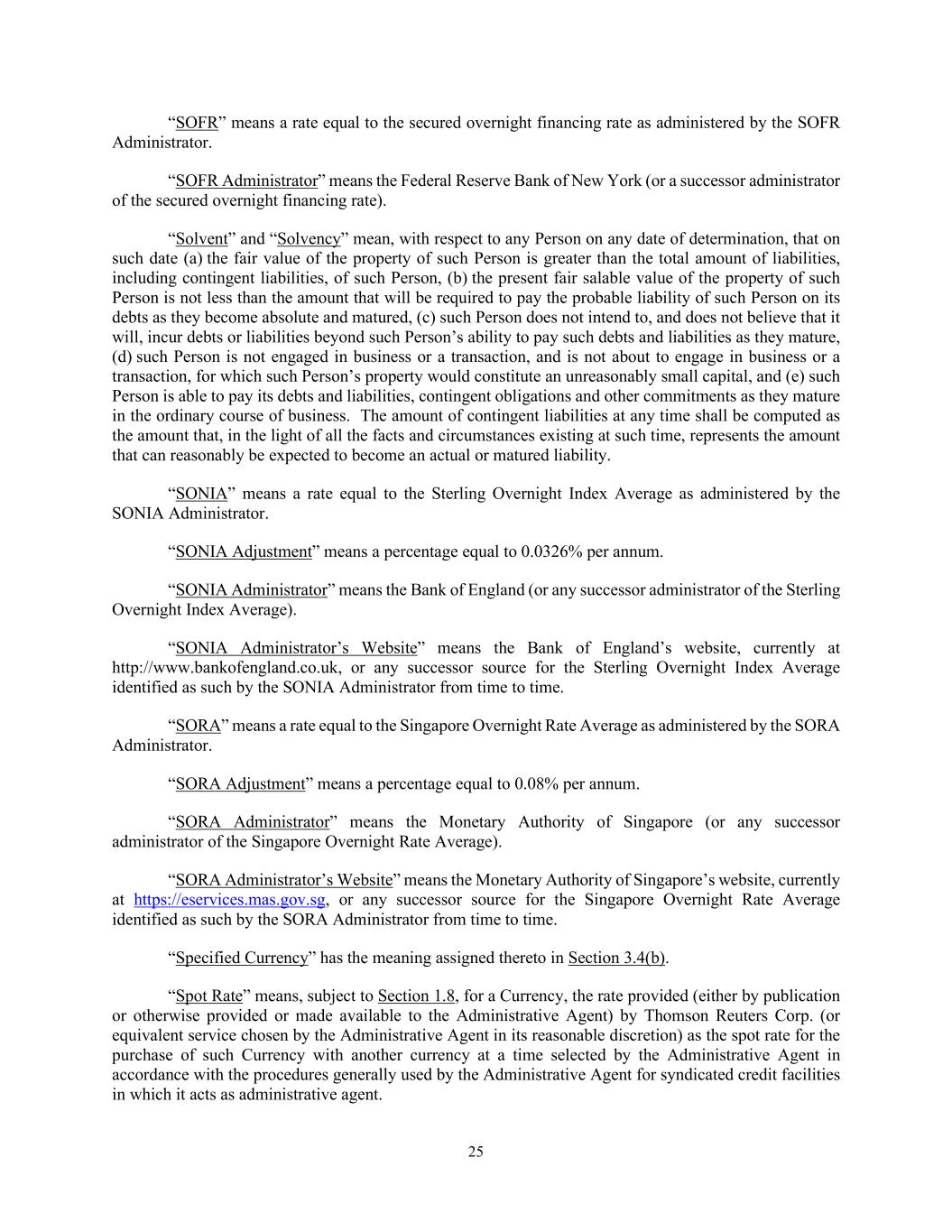 25 “SOFR” means a rate equal to the secured overnight financing rate as administered by the SOFR Administrator. “SOFR Administrator” means the Federal Reserve Bank of New York (or a successor administrator of the secured overnight financing rate). “Solvent” and “Solvency” mean, with respect to any Person on any date of determination, that on such date (a) the fair value of the property of such Person is greater than the total amount of liabilities, including contingent liabilities, of such Person, (b) the present fair salable value of the property of such Person is not less than the amount that will be required to pay the probable liability of such Person on its debts as they become absolute and matured, (c) such Person does not intend to, and does not believe that it will, incur debts or liabilities beyond such Person’s ability to pay such debts and liabilities as they mature, (d) such Person is not engaged in business or a transaction, and is not about to engage in business or a transaction, for which such Person’s property would constitute an unreasonably small capital, and (e) such Person is able to pay its debts and liabilities, contingent obligations and other commitments as they mature in the ordinary course of business. The amount of contingent liabilities at any time shall be computed as the amount that, in the light of all the facts and circumstances existing at such time, represents the amount that can reasonably be expected to become an actual or matured liability. “SONIA” means a rate equal to the Sterling Overnight Index Average as administered by the SONIA Administrator. “SONIA Adjustment” means a percentage equal to 0.0326% per annum. “SONIA Administrator” means the Bank of England (or any successor administrator of the Sterling Overnight Index Average). “SONIA Administrator’s Website” means the Bank of England’s website, currently at http://www.bankofengland.co.uk, or any successor source for the Sterling Overnight Index Average identified as such by the SONIA Administrator from time to time. “SORA” means a rate equal to the Singapore Overnight Rate Average as administered by the SORA Administrator. “SORA Adjustment” means a percentage equal to 0.08% per annum. “SORA Administrator” means the Monetary Authority of Singapore (or any successor administrator of the Singapore Overnight Rate Average). “SORA Administrator’s Website” means the Monetary Authority of Singapore’s website, currently at https://eservices.mas.gov.sg, or any successor source for the Singapore Overnight Rate Average identified as such by the SORA Administrator from time to time. “Specified Currency” has the meaning assigned thereto in Section 3.4(b). “Spot Rate” means, subject to Section 1.8, for a Currency, the rate provided (either by publication or otherwise provided or made available to the Administrative Agent) by Thomson Reuters Corp. (or equivalent service chosen by the Administrative Agent in its reasonable discretion) as the spot rate for the purchase of such Currency with another currency at a time selected by the Administrative Agent in accordance with the procedures generally used by the Administrative Agent for syndicated credit facilities in which it acts as administrative agent.