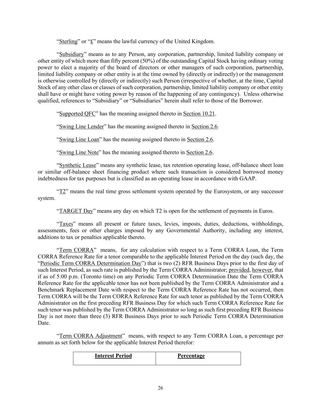 26 “Sterling” or “£” means the lawful currency of the United Kingdom. “Subsidiary” means as to any Person, any corporation, partnership, limited liability company or other entity of which more than fifty percent (50%) of the outstanding Capital Stock having ordinary voting power to elect a majority of the board of directors or other managers of such corporation, partnership, limited liability company or other entity is at the time owned by (directly or indirectly) or the management is otherwise controlled by (directly or indirectly) such Person (irrespective of whether, at the time, Capital Stock of any other class or classes of such corporation, partnership, limited liability company or other entity shall have or might have voting power by reason of the happening of any contingency). Unless otherwise qualified, references to “Subsidiary” or “Subsidiaries” herein shall refer to those of the Borrower. “Supported QFC” has the meaning assigned thereto in Section 10.21. “Swing Line Lender” has the meaning assigned thereto in Section 2.6. “Swing Line Loan” has the meaning assigned thereto in Section 2.6. “Swing Line Note” has the meaning assigned thereto in Section 2.6. “Synthetic Lease” means any synthetic lease, tax retention operating lease, off-balance sheet loan or similar off-balance sheet financing product where such transaction is considered borrowed money indebtedness for tax purposes but is classified as an operating lease in accordance with GAAP. “T2” means the real time gross settlement system operated by the Eurosystem, or any successor system. “TARGET Day” means any day on which T2 is open for the settlement of payments in Euros. “Taxes” means all present or future taxes, levies, imposts, duties, deductions, withholdings, assessments, fees or other charges imposed by any Governmental Authority, including any interest, additions to tax or penalties applicable thereto. “Term CORRA” means, for any calculation with respect to a Term CORRA Loan, the Term CORRA Reference Rate for a tenor comparable to the applicable Interest Period on the day (such day, the “Periodic Term CORRA Determination Day”) that is two (2) RFR Business Days prior to the first day of such Interest Period, as such rate is published by the Term CORRA Administrator; provided, however, that if as of 5:00 p.m. (Toronto time) on any Periodic Term CORRA Determination Date the Term CORRA Reference Rate for the applicable tenor has not been published by the Term CORRA Administrator and a Benchmark Replacement Date with respect to the Term CORRA Reference Rate has not occurred, then Term CORRA will be the Term CORRA Reference Rate for such tenor as published by the Term CORRA Administrator on the first preceding RFR Business Day for which such Term CORRA Reference Rate for such tenor was published by the Term CORRA Administrator so long as such first preceding RFR Business Day is not more than three (3) RFR Business Days prior to such Periodic Term CORRA Determination Date. “Term CORRA Adjustment” means, with respect to any Term CORRA Loan, a percentage per annum as set forth below for the applicable Interest Period therefor: Interest Period Percentage