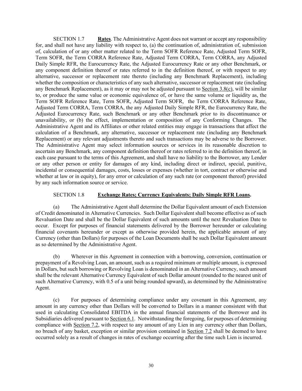 30 SECTION 1.7 Rates. The Administrative Agent does not warrant or accept any responsibility for, and shall not have any liability with respect to, (a) the continuation of, administration of, submission of, calculation of or any other matter related to the Term SOFR Reference Rate, Adjusted Term SOFR, Term SOFR, the Term CORRA Reference Rate, Adjusted Term CORRA, Term CORRA, any Adjusted Daily Simple RFR, the Eurocurrency Rate, the Adjusted Eurocurrency Rate or any other Benchmark, or any component definition thereof or rates referred to in the definition thereof, or with respect to any alternative, successor or replacement rate thereto (including any Benchmark Replacement), including whether the composition or characteristics of any such alternative, successor or replacement rate (including any Benchmark Replacement), as it may or may not be adjusted pursuant to Section 3.8(c), will be similar to, or produce the same value or economic equivalence of, or have the same volume or liquidity as, the Term SOFR Reference Rate, Term SOFR, Adjusted Term SOFR, the Term CORRA Reference Rate, Adjusted Term CORRA, Term CORRA, the any Adjusted Daily Simple RFR, the Eurocurrency Rate, the Adjusted Eurocurrency Rate, such Benchmark or any other Benchmark prior to its discontinuance or unavailability, or (b) the effect, implementation or composition of any Conforming Changes. The Administrative Agent and its Affiliates or other related entities may engage in transactions that affect the calculation of a Benchmark, any alternative, successor or replacement rate (including any Benchmark Replacement) or any relevant adjustments thereto and such transactions may be adverse to the Borrower. The Administrative Agent may select information sources or services in its reasonable discretion to ascertain any Benchmark, any component definition thereof or rates referred to in the definition thereof, in each case pursuant to the terms of this Agreement, and shall have no liability to the Borrower, any Lender or any other person or entity for damages of any kind, including direct or indirect, special, punitive, incidental or consequential damages, costs, losses or expenses (whether in tort, contract or otherwise and whether at law or in equity), for any error or calculation of any such rate (or component thereof) provided by any such information source or service. SECTION 1.8 Exchange Rates; Currency Equivalents; Daily Simple RFR Loans. (a) The Administrative Agent shall determine the Dollar Equivalent amount of each Extension of Credit denominated in Alternative Currencies. Such Dollar Equivalent shall become effective as of such Revaluation Date and shall be the Dollar Equivalent of such amounts until the next Revaluation Date to occur. Except for purposes of financial statements delivered by the Borrower hereunder or calculating financial covenants hereunder or except as otherwise provided herein, the applicable amount of any Currency (other than Dollars) for purposes of the Loan Documents shall be such Dollar Equivalent amount as so determined by the Administrative Agent. (b) Wherever in this Agreement in connection with a borrowing, conversion, continuation or prepayment of a Revolving Loan, an amount, such as a required minimum or multiple amount, is expressed in Dollars, but such borrowing or Revolving Loan is denominated in an Alternative Currency, such amount shall be the relevant Alternative Currency Equivalent of such Dollar amount (rounded to the nearest unit of such Alternative Currency, with 0.5 of a unit being rounded upward), as determined by the Administrative Agent. (c) For purposes of determining compliance under any covenant in this Agreement, any amount in any currency other than Dollars will be converted to Dollars in a manner consistent with that used in calculating Consolidated EBITDA in the annual financial statements of the Borrower and its Subsidiaries delivered pursuant to Section 6.1. Notwithstanding the foregoing, for purposes of determining compliance with Section 7.2, with respect to any amount of any Lien in any currency other than Dollars, no breach of any basket, exception or similar provision contained in Section 7.2 shall be deemed to have occurred solely as a result of changes in rates of exchange occurring after the time such Lien is incurred.