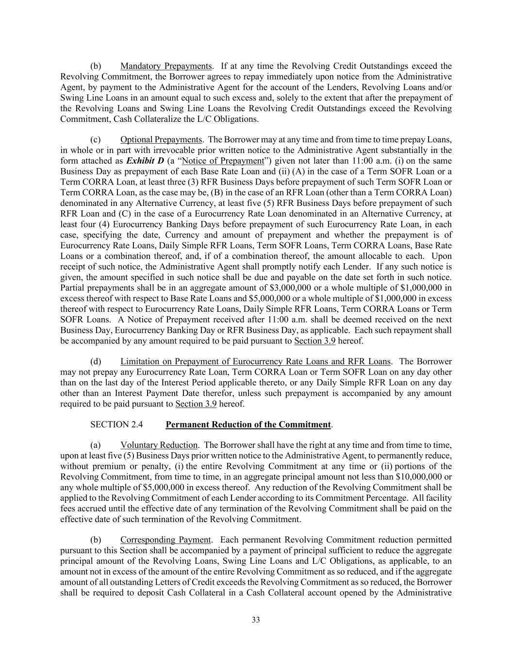 33 (b) Mandatory Prepayments. If at any time the Revolving Credit Outstandings exceed the Revolving Commitment, the Borrower agrees to repay immediately upon notice from the Administrative Agent, by payment to the Administrative Agent for the account of the Lenders, Revolving Loans and/or Swing Line Loans in an amount equal to such excess and, solely to the extent that after the prepayment of the Revolving Loans and Swing Line Loans the Revolving Credit Outstandings exceed the Revolving Commitment, Cash Collateralize the L/C Obligations. (c) Optional Prepayments. The Borrower may at any time and from time to time prepay Loans, in whole or in part with irrevocable prior written notice to the Administrative Agent substantially in the form attached as Exhibit D (a “Notice of Prepayment”) given not later than 11:00 a.m. (i) on the same Business Day as prepayment of each Base Rate Loan and (ii) (A) in the case of a Term SOFR Loan or a Term CORRA Loan, at least three (3) RFR Business Days before prepayment of such Term SOFR Loan or Term CORRA Loan, as the case may be, (B) in the case of an RFR Loan (other than a Term CORRA Loan) denominated in any Alternative Currency, at least five (5) RFR Business Days before prepayment of such RFR Loan and (C) in the case of a Eurocurrency Rate Loan denominated in an Alternative Currency, at least four (4) Eurocurrency Banking Days before prepayment of such Eurocurrency Rate Loan, in each case, specifying the date, Currency and amount of prepayment and whether the prepayment is of Eurocurrency Rate Loans, Daily Simple RFR Loans, Term SOFR Loans, Term CORRA Loans, Base Rate Loans or a combination thereof, and, if of a combination thereof, the amount allocable to each. Upon receipt of such notice, the Administrative Agent shall promptly notify each Lender. If any such notice is given, the amount specified in such notice shall be due and payable on the date set forth in such notice. Partial prepayments shall be in an aggregate amount of $3,000,000 or a whole multiple of $1,000,000 in excess thereof with respect to Base Rate Loans and $5,000,000 or a whole multiple of $1,000,000 in excess thereof with respect to Eurocurrency Rate Loans, Daily Simple RFR Loans, Term CORRA Loans or Term SOFR Loans. A Notice of Prepayment received after 11:00 a.m. shall be deemed received on the next Business Day, Eurocurrency Banking Day or RFR Business Day, as applicable. Each such repayment shall be accompanied by any amount required to be paid pursuant to Section 3.9 hereof. (d) Limitation on Prepayment of Eurocurrency Rate Loans and RFR Loans. The Borrower may not prepay any Eurocurrency Rate Loan, Term CORRA Loan or Term SOFR Loan on any day other than on the last day of the Interest Period applicable thereto, or any Daily Simple RFR Loan on any day other than an Interest Payment Date therefor, unless such prepayment is accompanied by any amount required to be paid pursuant to Section 3.9 hereof. SECTION 2.4 Permanent Reduction of the Commitment. (a) Voluntary Reduction. The Borrower shall have the right at any time and from time to time, upon at least five (5) Business Days prior written notice to the Administrative Agent, to permanently reduce, without premium or penalty, (i) the entire Revolving Commitment at any time or (ii) portions of the Revolving Commitment, from time to time, in an aggregate principal amount not less than $10,000,000 or any whole multiple of $5,000,000 in excess thereof. Any reduction of the Revolving Commitment shall be applied to the Revolving Commitment of each Lender according to its Commitment Percentage. All facility fees accrued until the effective date of any termination of the Revolving Commitment shall be paid on the effective date of such termination of the Revolving Commitment. (b) Corresponding Payment. Each permanent Revolving Commitment reduction permitted pursuant to this Section shall be accompanied by a payment of principal sufficient to reduce the aggregate principal amount of the Revolving Loans, Swing Line Loans and L/C Obligations, as applicable, to an amount not in excess of the amount of the entire Revolving Commitment as so reduced, and if the aggregate amount of all outstanding Letters of Credit exceeds the Revolving Commitment as so reduced, the Borrower shall be required to deposit Cash Collateral in a Cash Collateral account opened by the Administrative