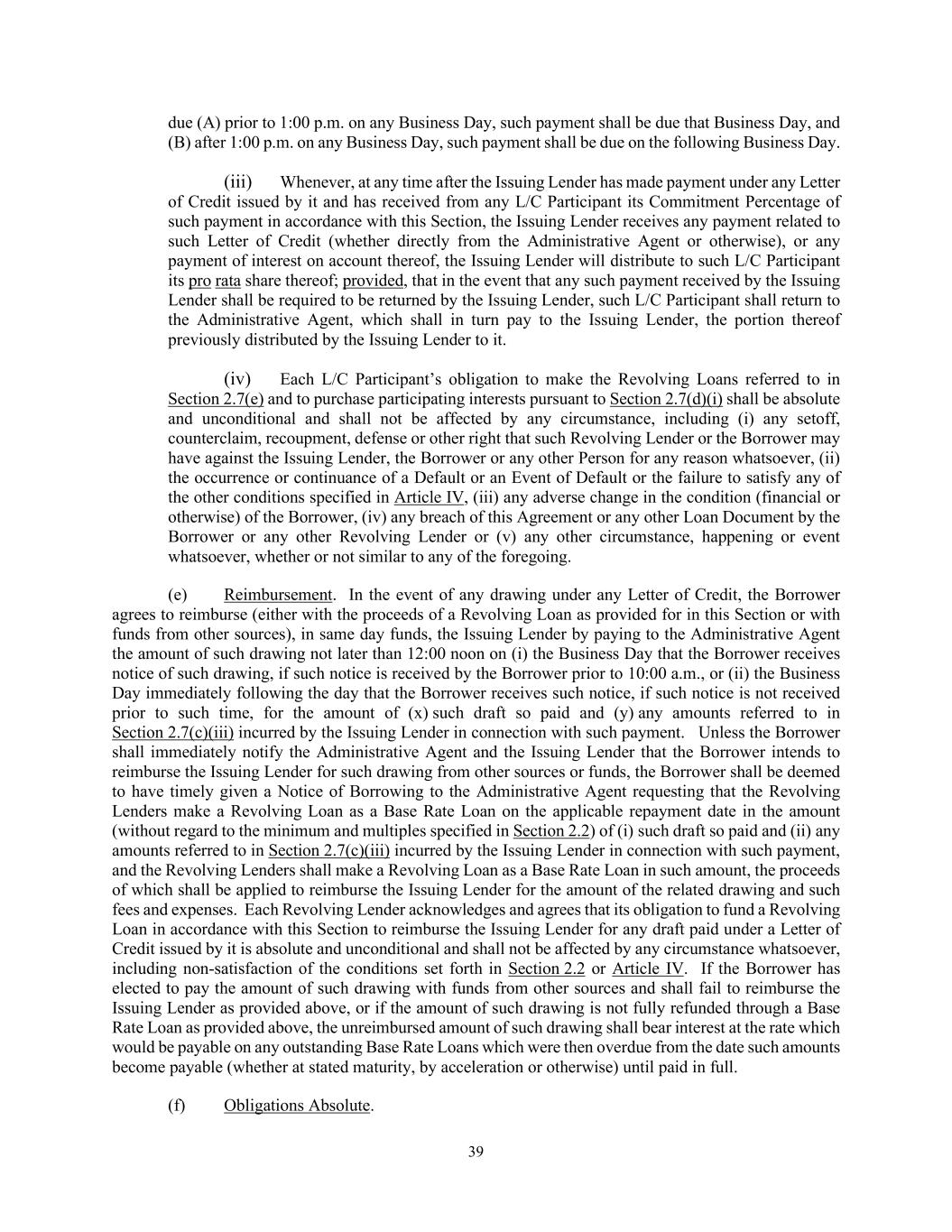 39 due (A) prior to 1:00 p.m. on any Business Day, such payment shall be due that Business Day, and (B) after 1:00 p.m. on any Business Day, such payment shall be due on the following Business Day. (iii) Whenever, at any time after the Issuing Lender has made payment under any Letter of Credit issued by it and has received from any L/C Participant its Commitment Percentage of such payment in accordance with this Section, the Issuing Lender receives any payment related to such Letter of Credit (whether directly from the Administrative Agent or otherwise), or any payment of interest on account thereof, the Issuing Lender will distribute to such L/C Participant its pro rata share thereof; provided, that in the event that any such payment received by the Issuing Lender shall be required to be returned by the Issuing Lender, such L/C Participant shall return to the Administrative Agent, which shall in turn pay to the Issuing Lender, the portion thereof previously distributed by the Issuing Lender to it. (iv) Each L/C Participant’s obligation to make the Revolving Loans referred to in Section 2.7(e) and to purchase participating interests pursuant to Section 2.7(d)(i) shall be absolute and unconditional and shall not be affected by any circumstance, including (i) any setoff, counterclaim, recoupment, defense or other right that such Revolving Lender or the Borrower may have against the Issuing Lender, the Borrower or any other Person for any reason whatsoever, (ii) the occurrence or continuance of a Default or an Event of Default or the failure to satisfy any of the other conditions specified in Article IV, (iii) any adverse change in the condition (financial or otherwise) of the Borrower, (iv) any breach of this Agreement or any other Loan Document by the Borrower or any other Revolving Lender or (v) any other circumstance, happening or event whatsoever, whether or not similar to any of the foregoing. (e) Reimbursement. In the event of any drawing under any Letter of Credit, the Borrower agrees to reimburse (either with the proceeds of a Revolving Loan as provided for in this Section or with funds from other sources), in same day funds, the Issuing Lender by paying to the Administrative Agent the amount of such drawing not later than 12:00 noon on (i) the Business Day that the Borrower receives notice of such drawing, if such notice is received by the Borrower prior to 10:00 a.m., or (ii) the Business Day immediately following the day that the Borrower receives such notice, if such notice is not received prior to such time, for the amount of (x) such draft so paid and (y) any amounts referred to in Section 2.7(c)(iii) incurred by the Issuing Lender in connection with such payment. Unless the Borrower shall immediately notify the Administrative Agent and the Issuing Lender that the Borrower intends to reimburse the Issuing Lender for such drawing from other sources or funds, the Borrower shall be deemed to have timely given a Notice of Borrowing to the Administrative Agent requesting that the Revolving Lenders make a Revolving Loan as a Base Rate Loan on the applicable repayment date in the amount (without regard to the minimum and multiples specified in Section 2.2) of (i) such draft so paid and (ii) any amounts referred to in Section 2.7(c)(iii) incurred by the Issuing Lender in connection with such payment, and the Revolving Lenders shall make a Revolving Loan as a Base Rate Loan in such amount, the proceeds of which shall be applied to reimburse the Issuing Lender for the amount of the related drawing and such fees and expenses. Each Revolving Lender acknowledges and agrees that its obligation to fund a Revolving Loan in accordance with this Section to reimburse the Issuing Lender for any draft paid under a Letter of Credit issued by it is absolute and unconditional and shall not be affected by any circumstance whatsoever, including non-satisfaction of the conditions set forth in Section 2.2 or Article IV. If the Borrower has elected to pay the amount of such drawing with funds from other sources and shall fail to reimburse the Issuing Lender as provided above, or if the amount of such drawing is not fully refunded through a Base Rate Loan as provided above, the unreimbursed amount of such drawing shall bear interest at the rate which would be payable on any outstanding Base Rate Loans which were then overdue from the date such amounts become payable (whether at stated maturity, by acceleration or otherwise) until paid in full. (f) Obligations Absolute.